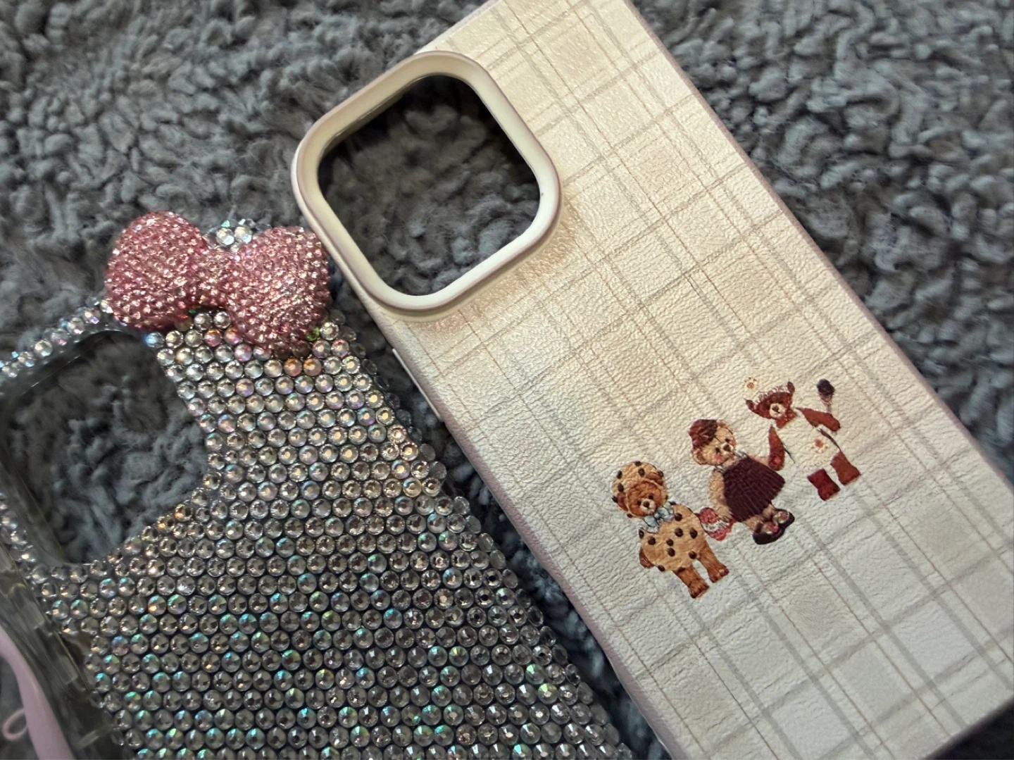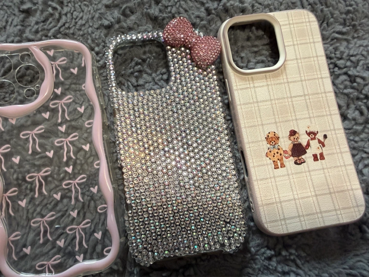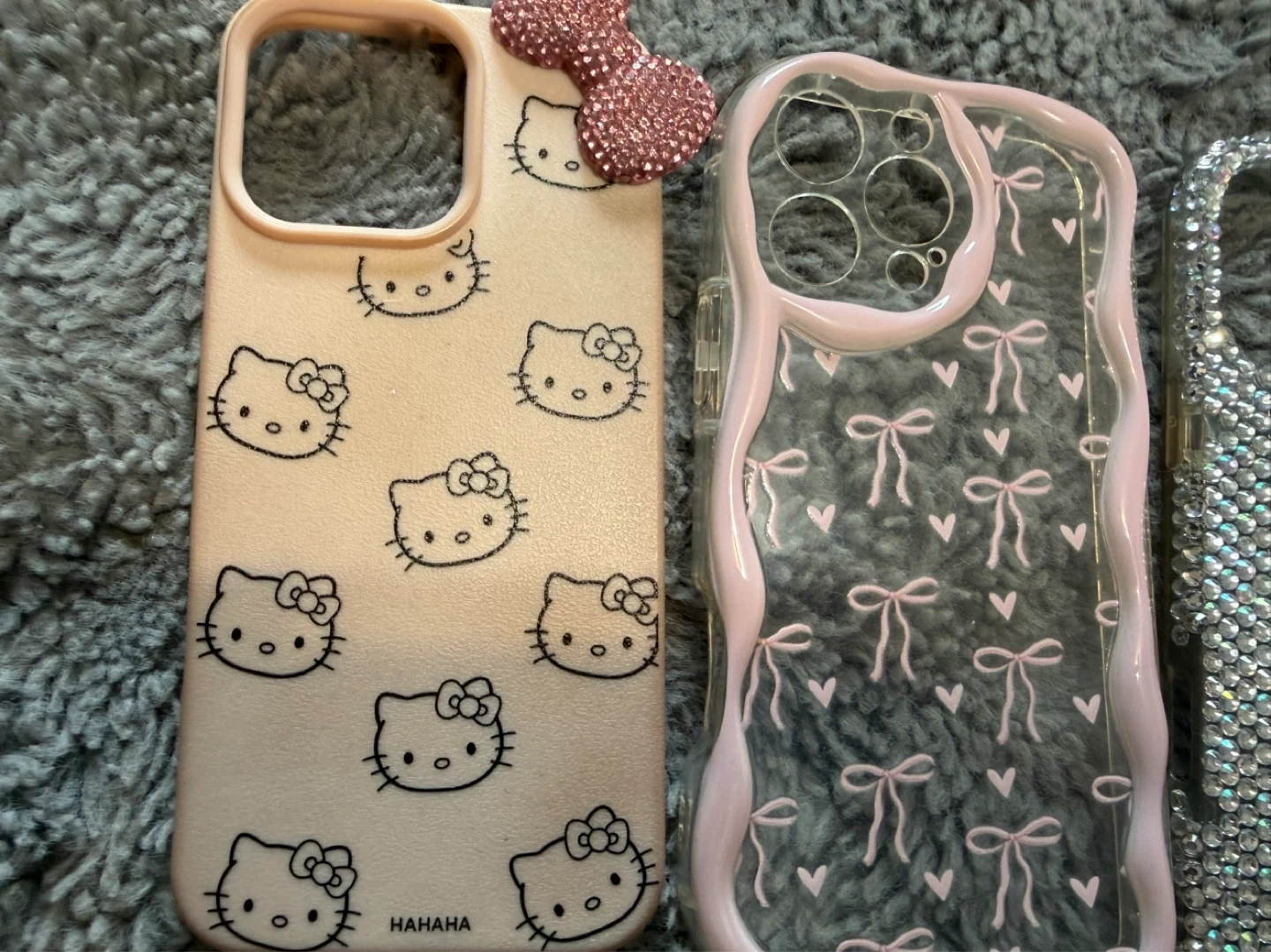 A set of four decorative phone cases. Includes two Hello Kitty designs, one with bows and hearts, and another sparkly gem-covered case. There's also a case with bears and a plain pink one. A beaded bracelet with an 'X' charm is also included.