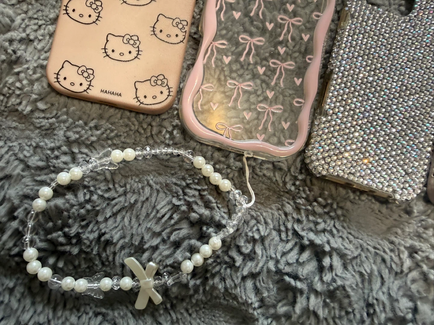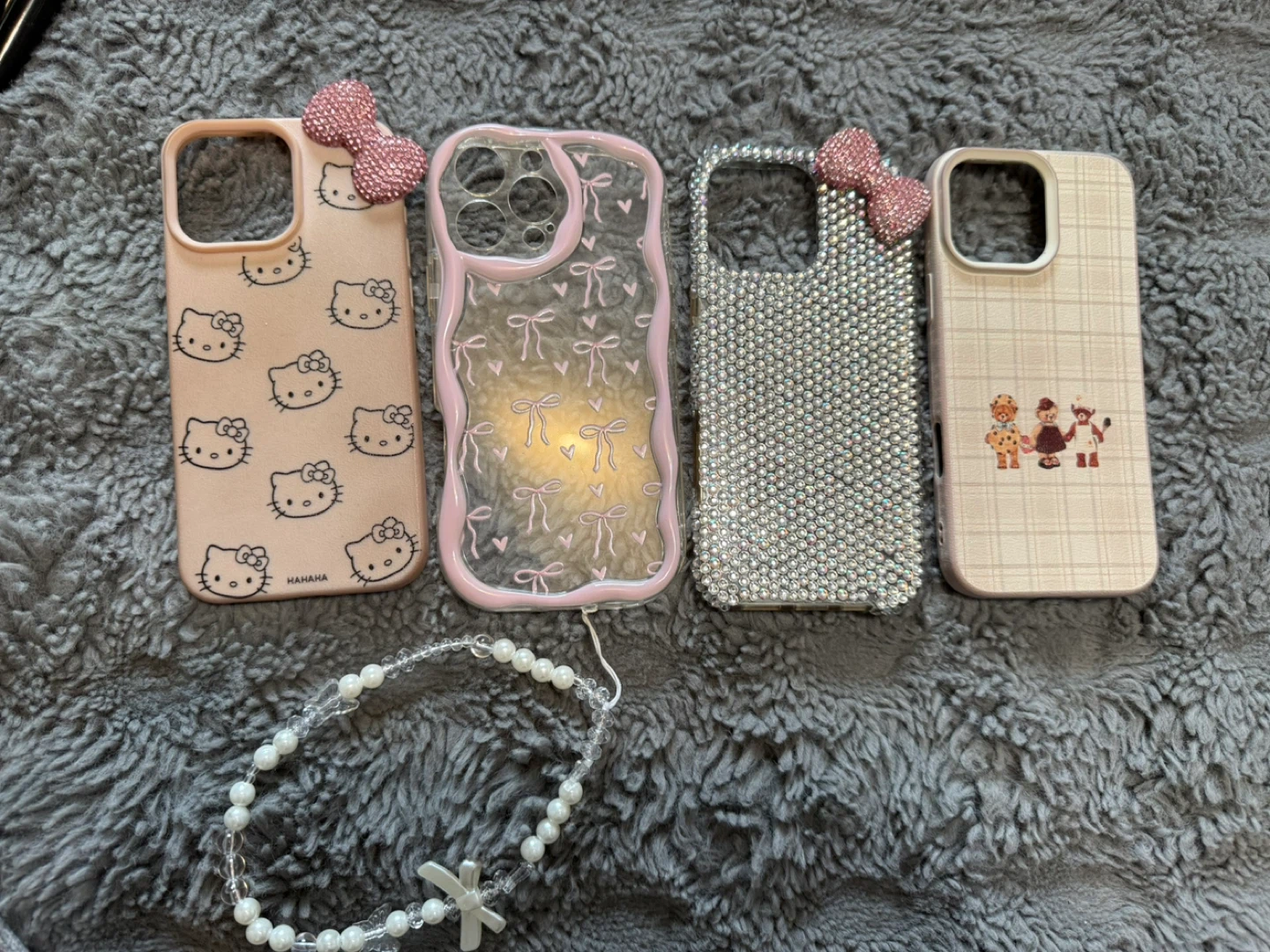A set of four decorative phone cases. Includes two Hello Kitty designs, one with bows and hearts, and another sparkly gem-covered case. There's also a case with bears and a plain pink one. A beaded bracelet with an 'X' charm is also included.