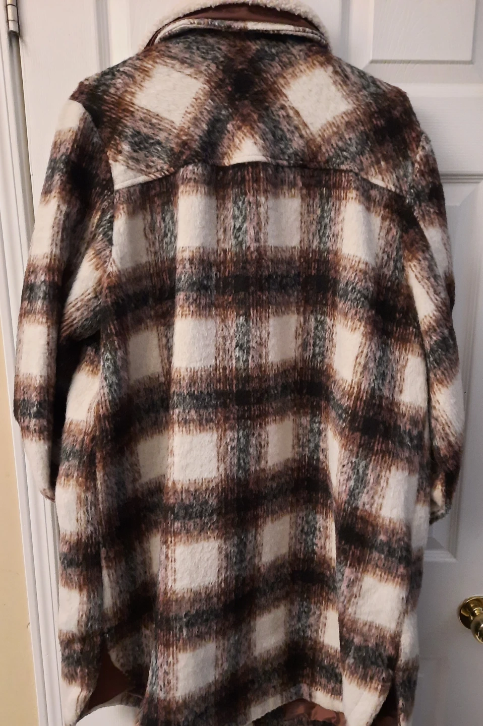 Cozy plaid jacket with a warm sherpa collar. It's a longline style with front pockets and button closures. This jacket is size XL and perfect for cooler weather!