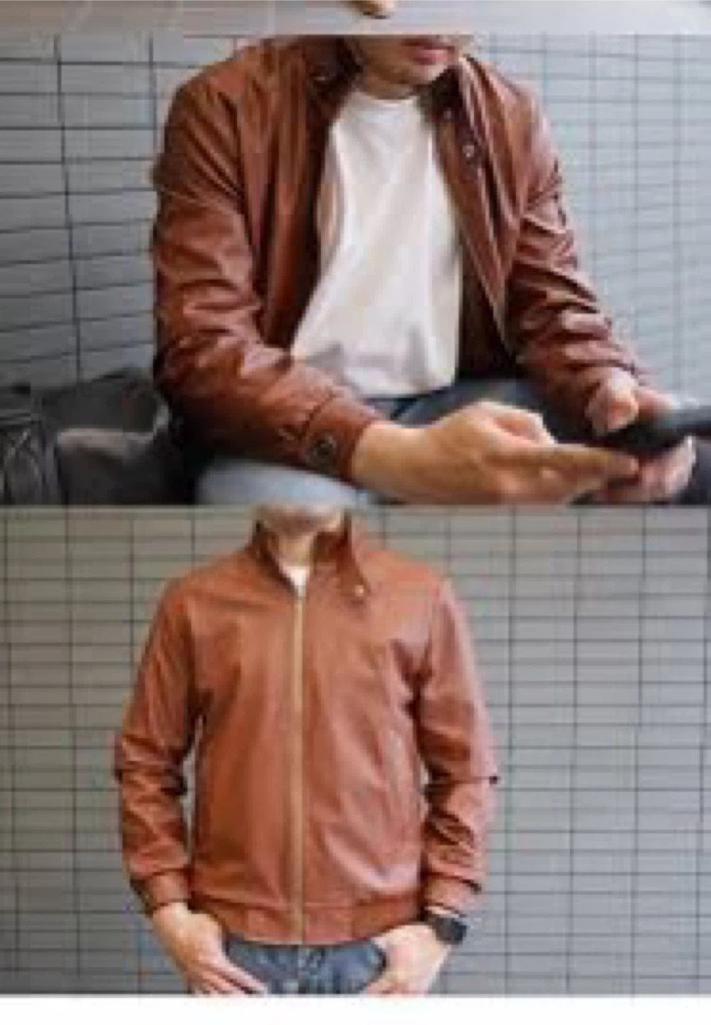A stylish brown faux leather jacket with a zip-up front. It has a classic collar and buttoned cuffs. Looks good for casual wear!
