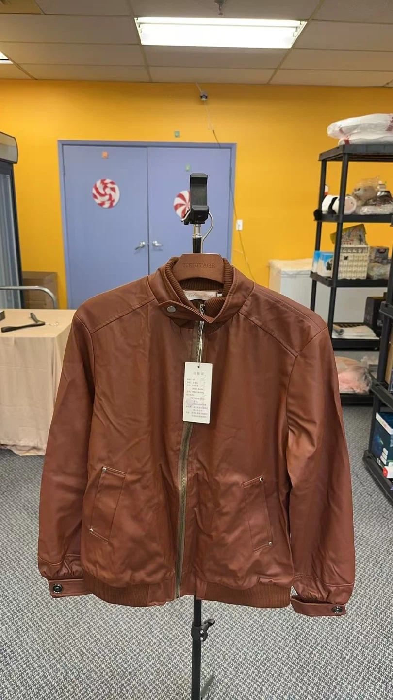 A stylish brown faux leather jacket with a zip-up front. It has a classic collar and buttoned cuffs. Looks good for casual wear!