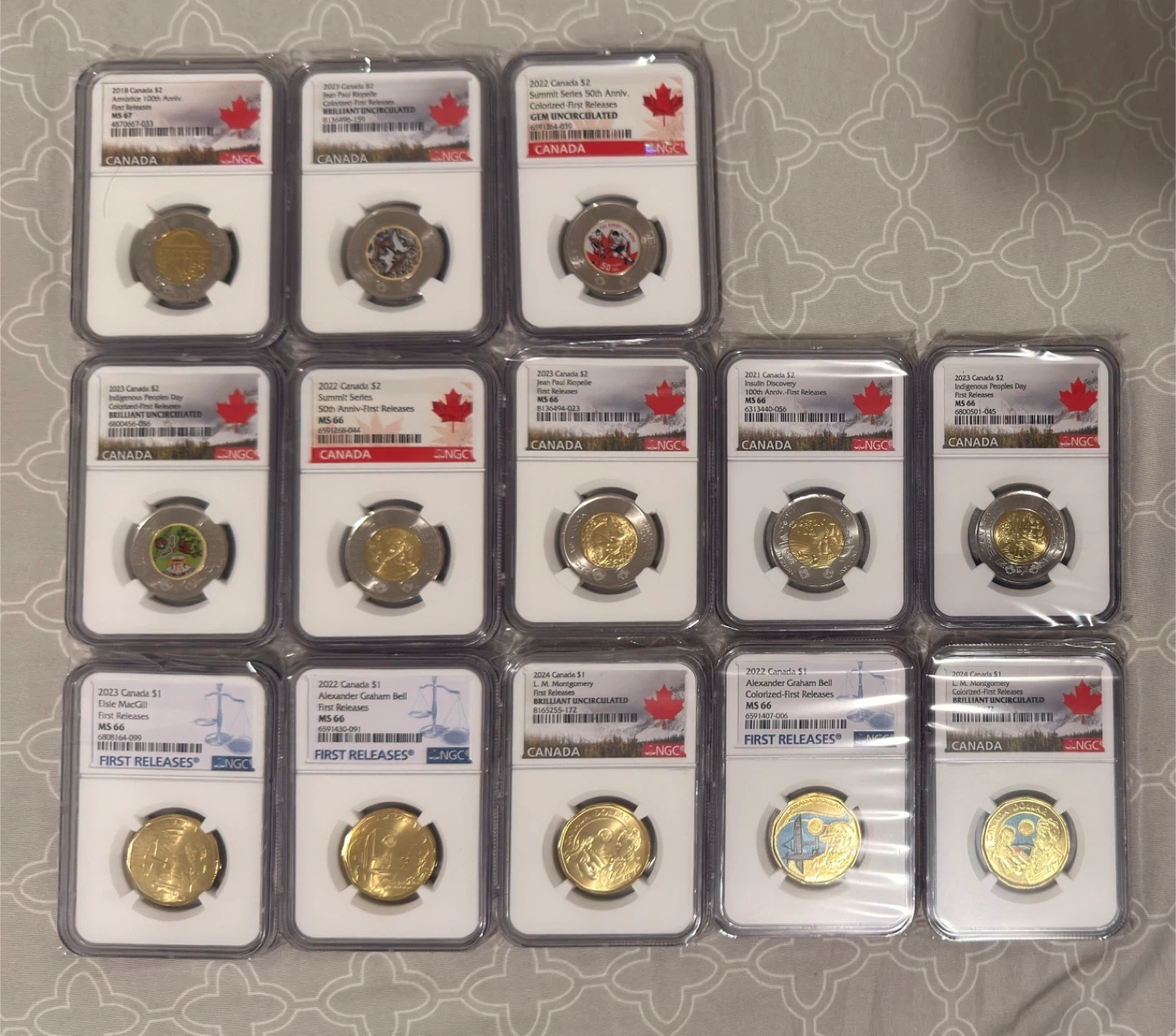 A collection of various Canada $1 and $2 coins. These coins are identified as First Releases, with some being Brilliant Uncirculated or GEM Uncirculated. Several coins feature colourized designs and special themes like Indigenous Peoples Day and the Summit Series.