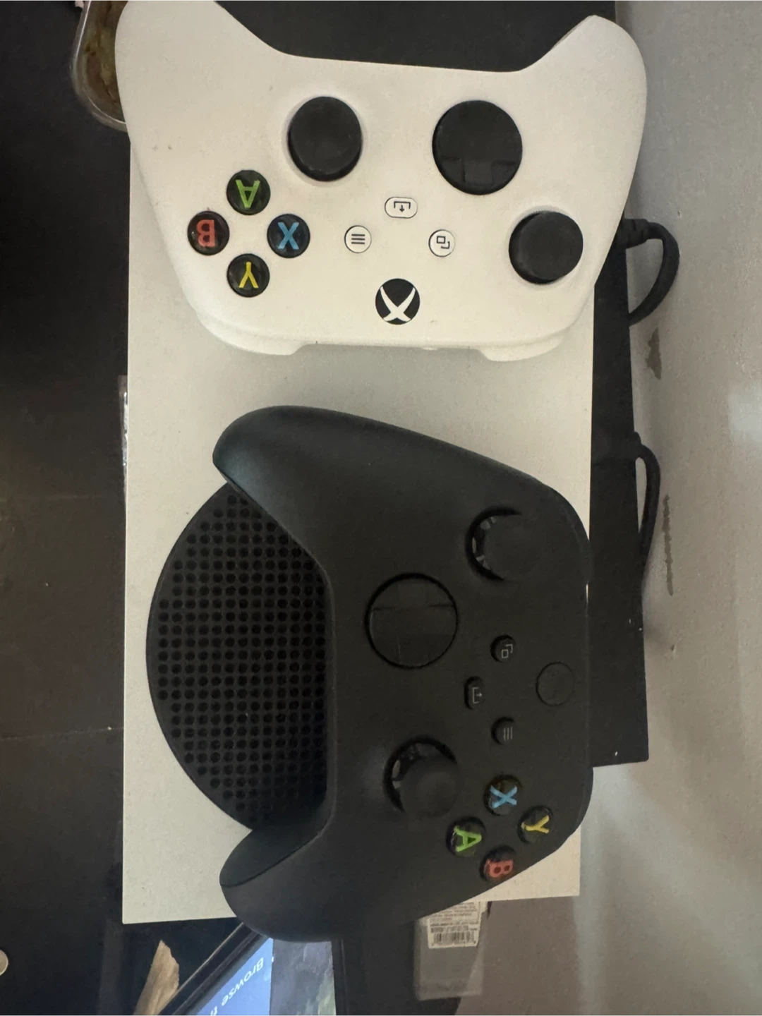 Selling a white Xbox Series S console. It's in good working order and comes with two controllers, one white and one black. These consoles are great for gaming on the go or as a secondary console!