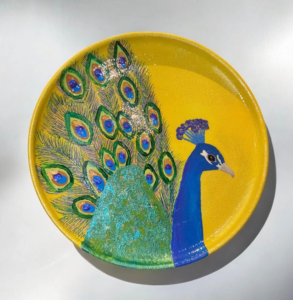 Check out this unique, hand-painted plate featuring a beautiful peacock design! The plate is a vibrant yellow colour, making it a lovely decorative piece for your home.