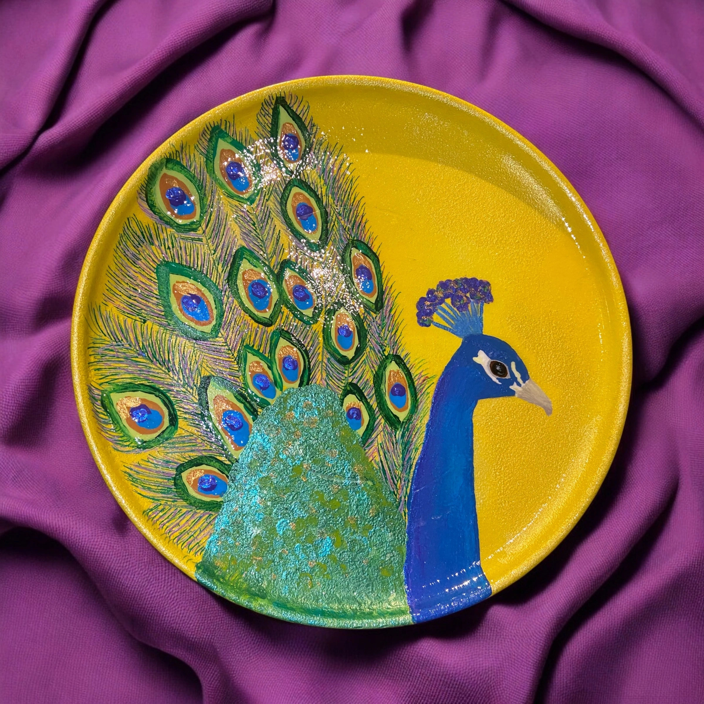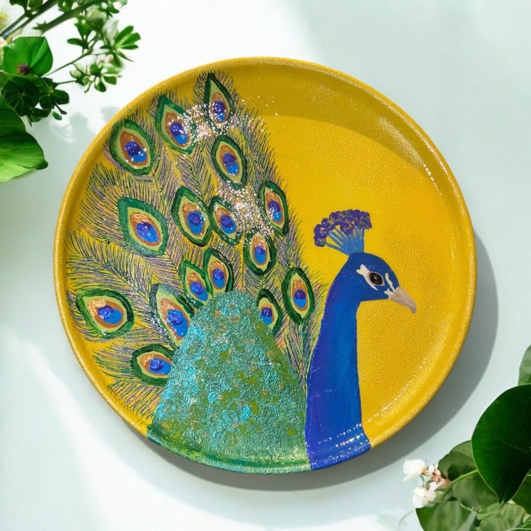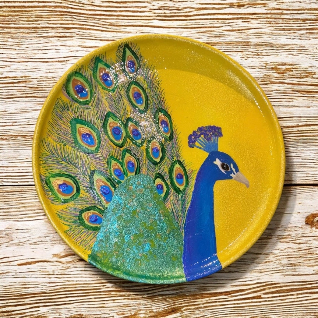 Check out this unique, hand-painted plate featuring a beautiful peacock design! The plate is a vibrant yellow colour, making it a lovely decorative piece for your home.