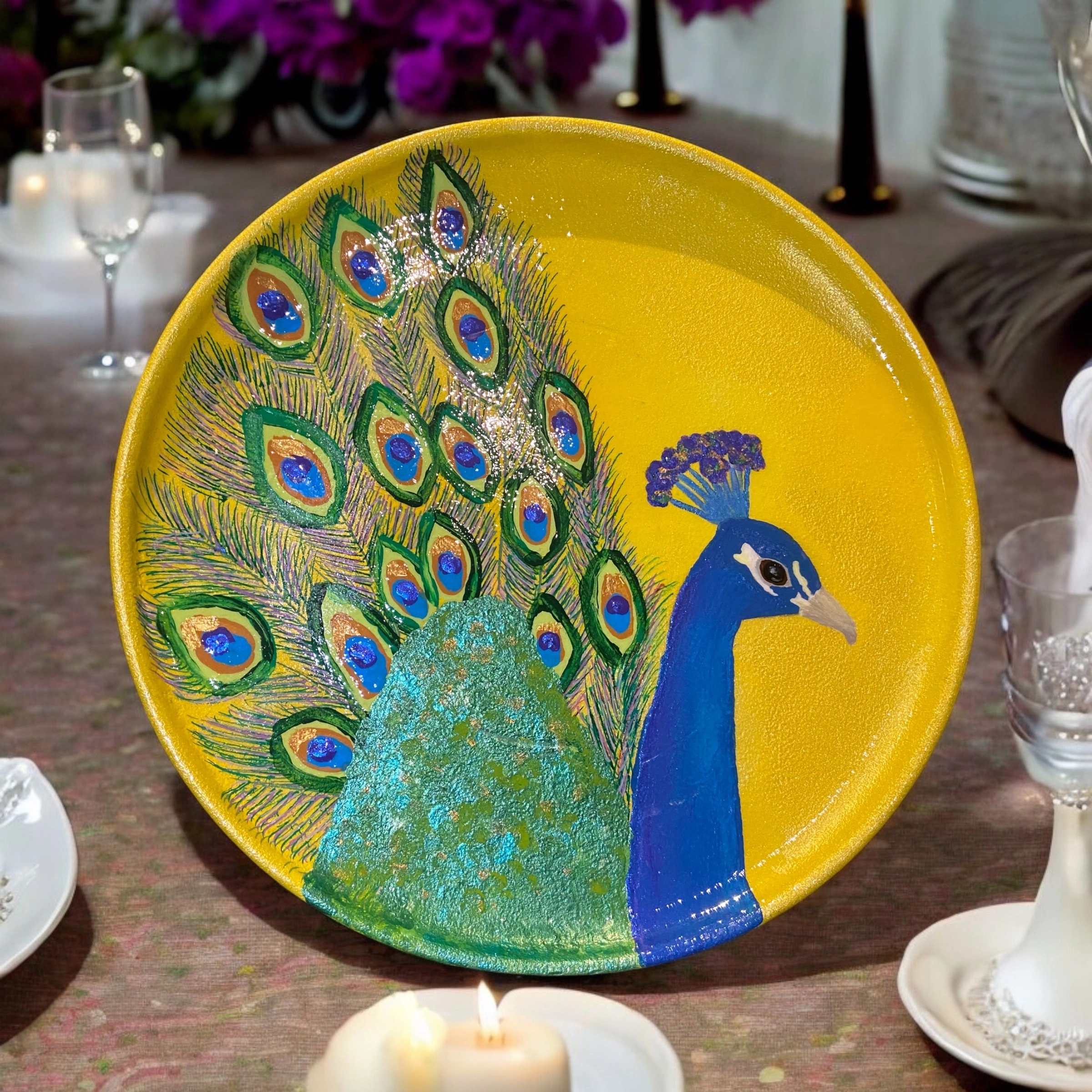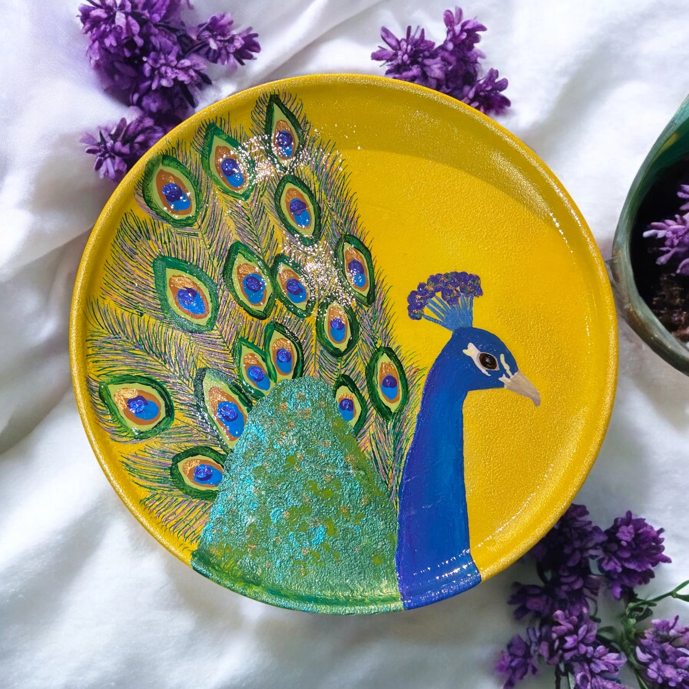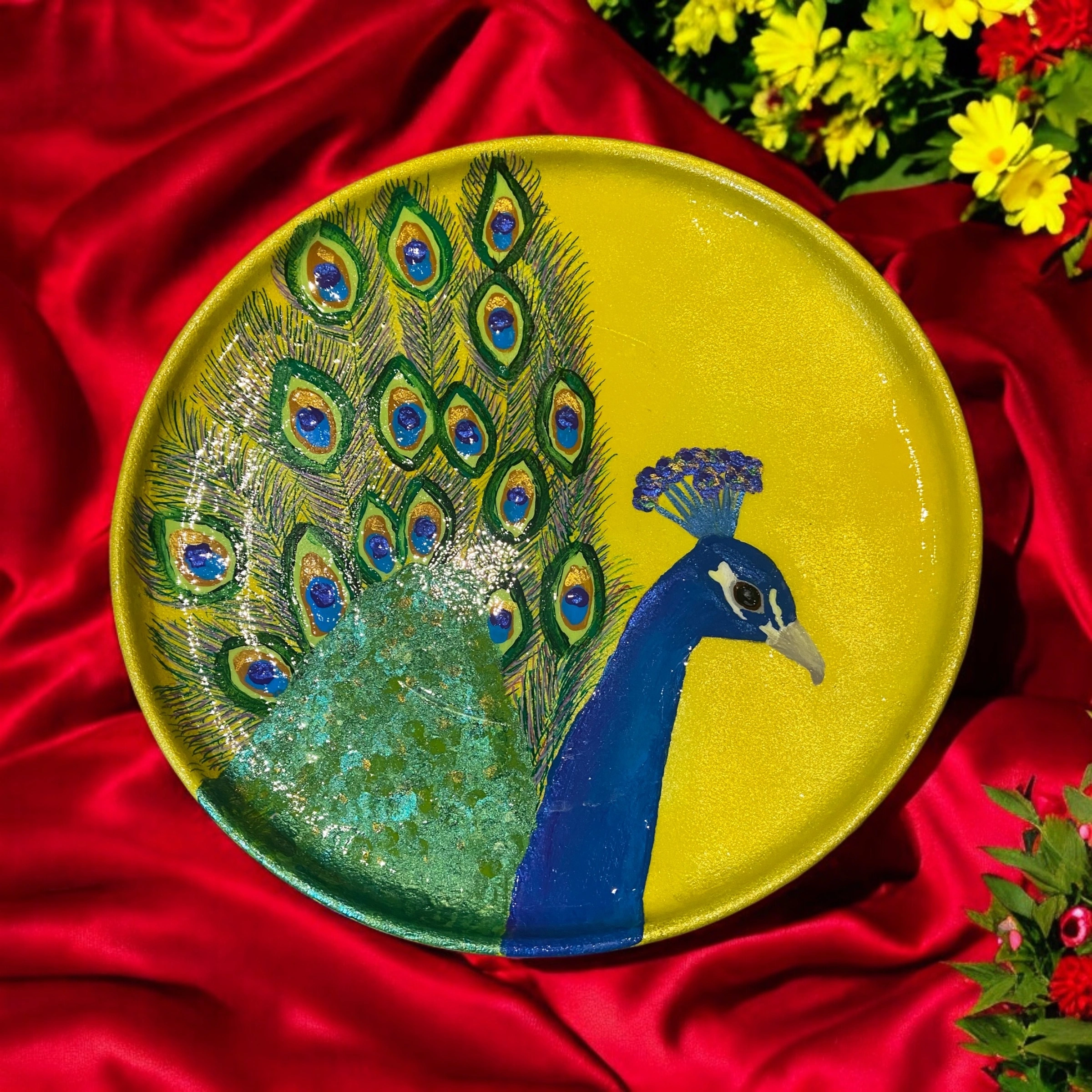 Check out this unique, hand-painted plate featuring a beautiful peacock design! The plate is a vibrant yellow colour, making it a lovely decorative piece for your home.