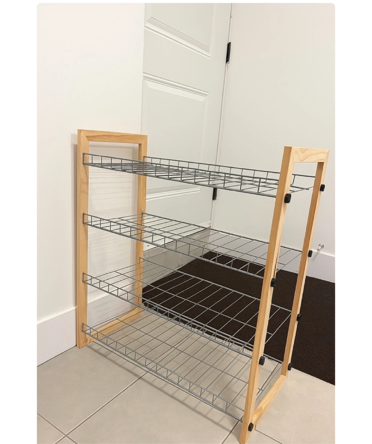 I'm selling a shoe rack with a light wooden frame and wire shelves. It's perfect for keeping your shoes organized and off the floor. The rack has three tiers, providing ample space for various footwear.