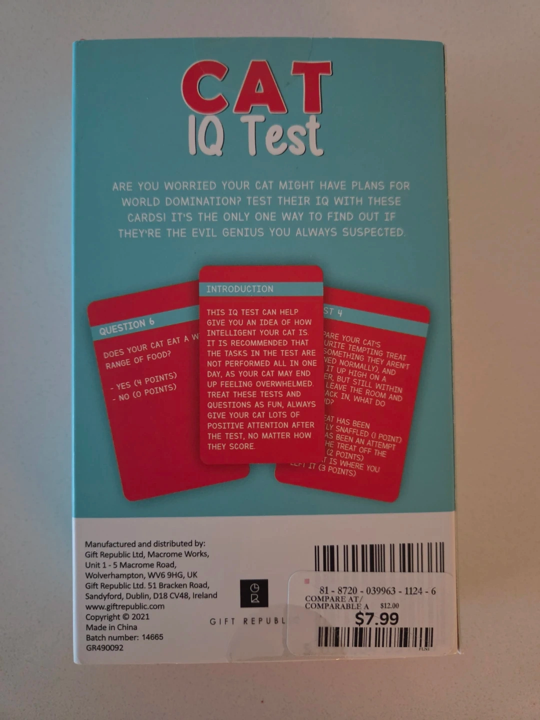This game includes 100 cards to test your cat's IQ. The cards have different questions and scoring systems to help you figure out your cat's intelligence level. It's a fun way to interact with your feline friend!