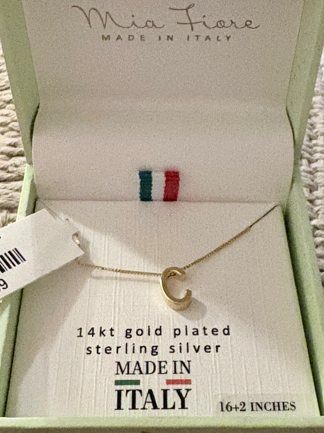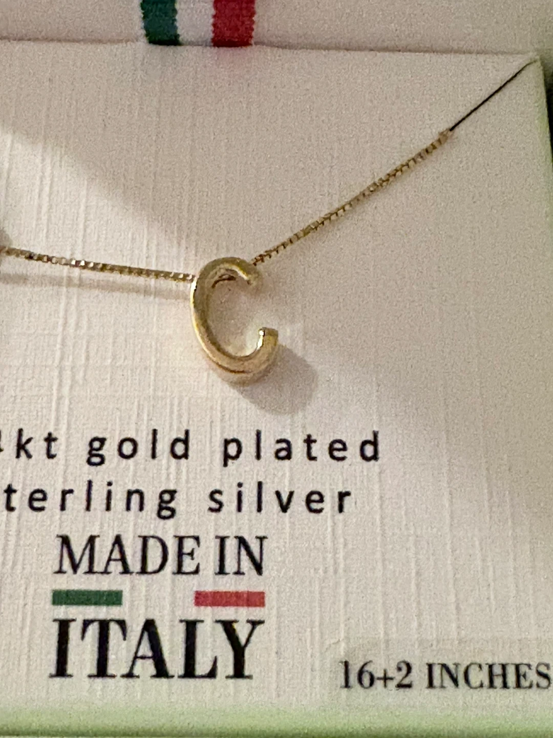 This Mia Fiore necklace features a "C" pendant. It's 14kt gold plated over sterling silver. The chain is 16+2 inches long. Made in Italy!