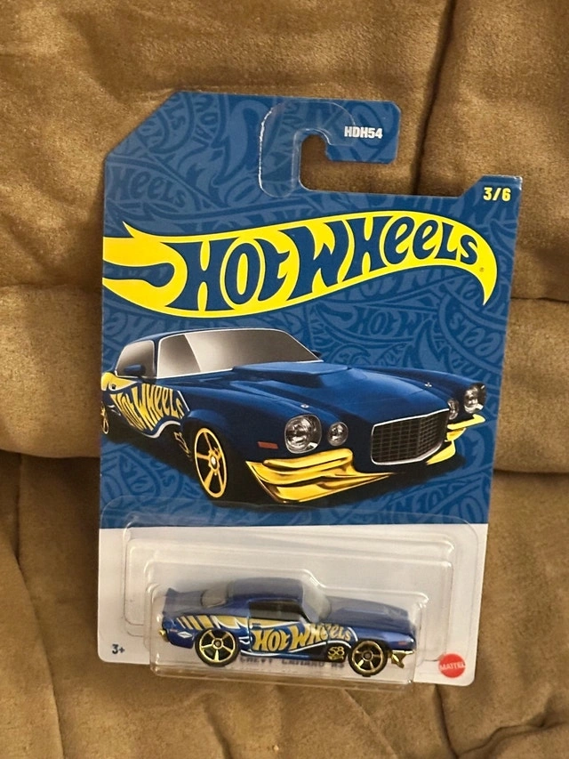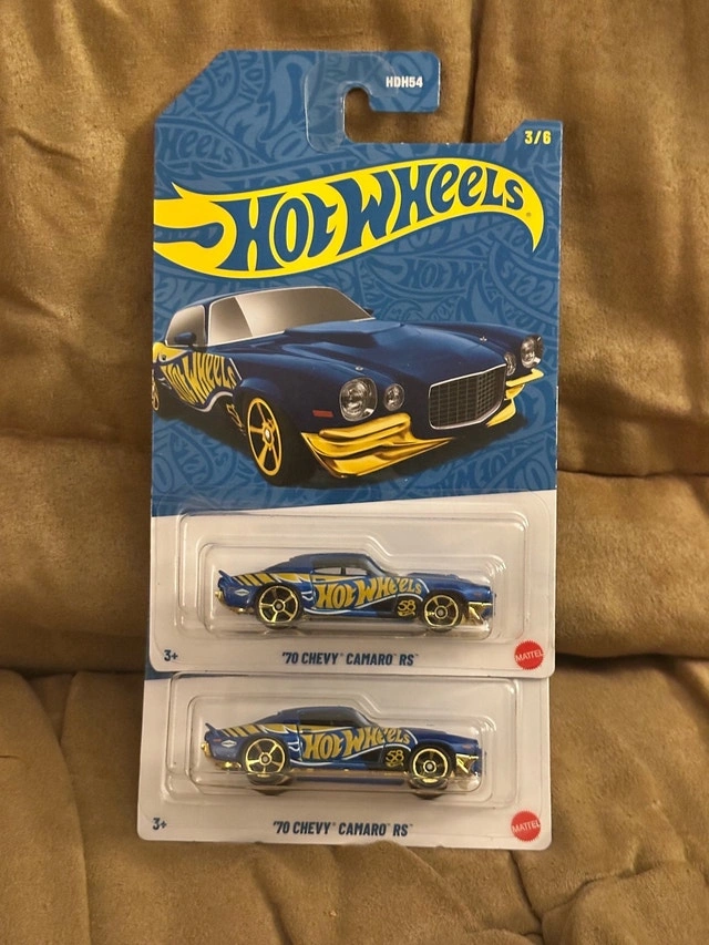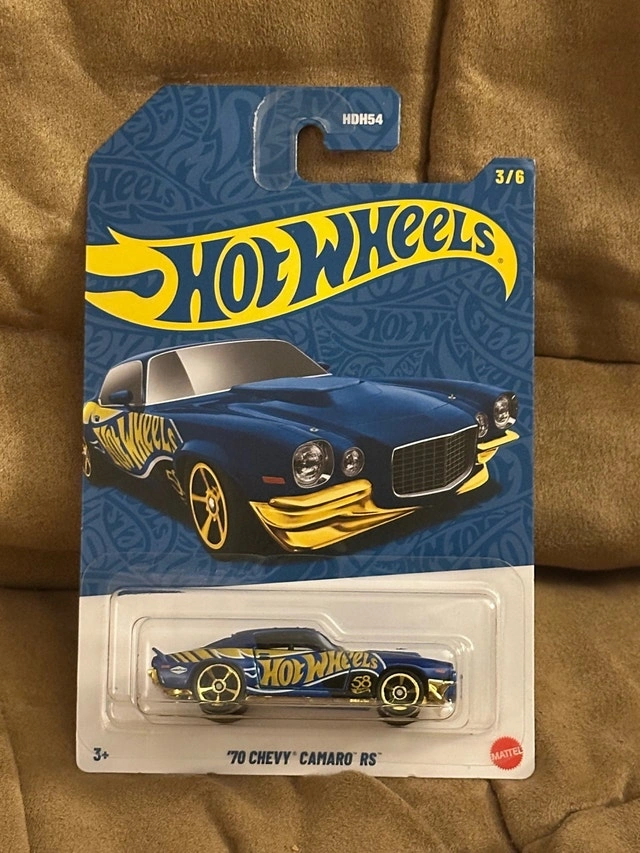 I am selling a new Hot Wheels '70 Chevy Camaro RS diecast car, still in its original packaging. This collectible car features a blue and gold colour scheme. A great addition to any Hot Wheels collection! Make: Chevrolet, Model: Camaro RS, Year: 1970. Cash accepted, Cashless payment accepted.