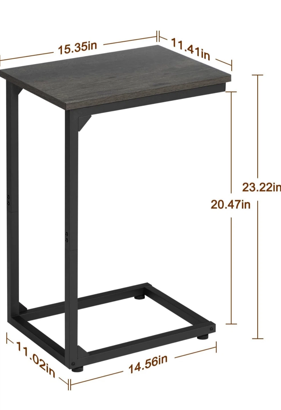 It features a dark wood top and a sturdy black metal frame. The dimensions are approximately 15.35 inches wide, 11.41 inches deep, and 23.22 inches high.