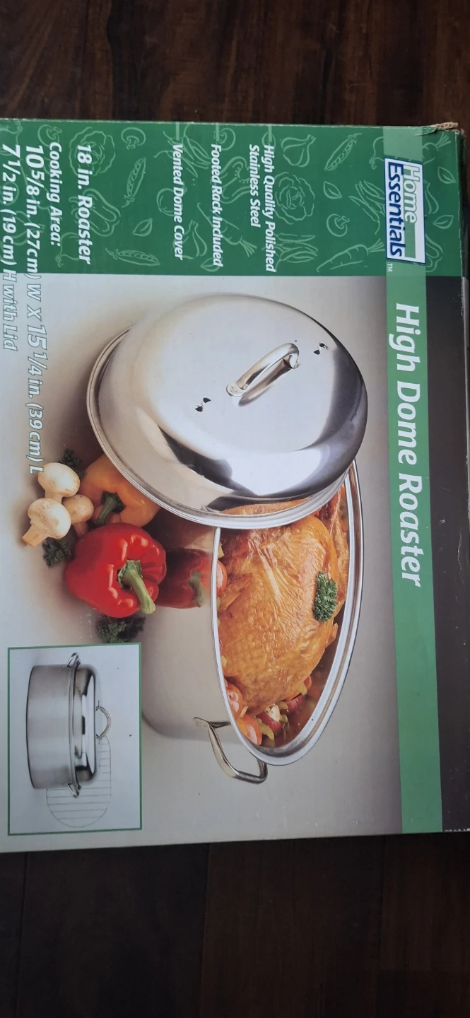 This is an 18-inch High Dome Roaster from Home Essentials. It's made of high-quality polished stainless steel and includes a vented dome cover. A footed rack is also included for convenience. Cooking area: 10 5/8" W x 15 1/4" L x 7 1/2" H.