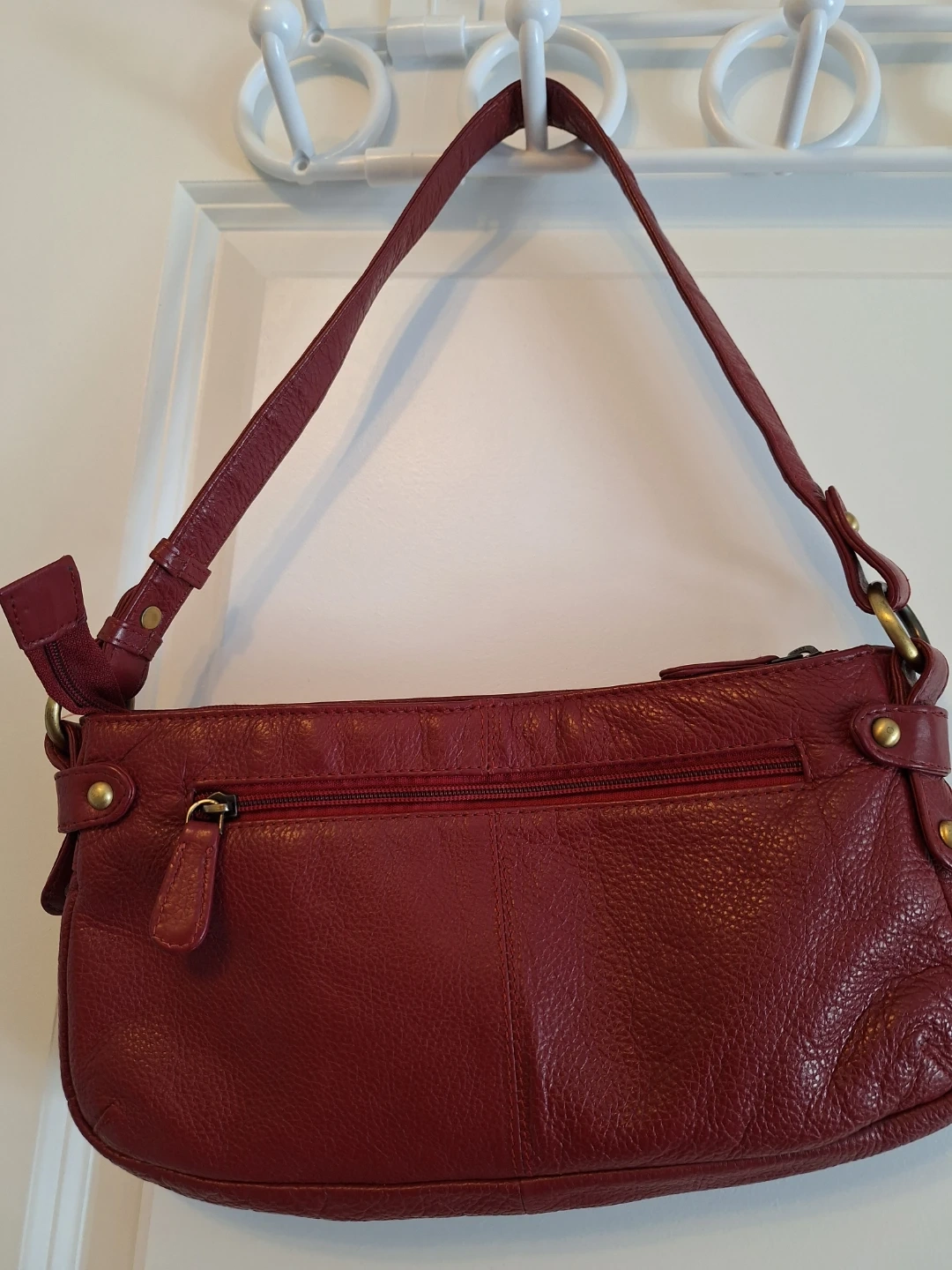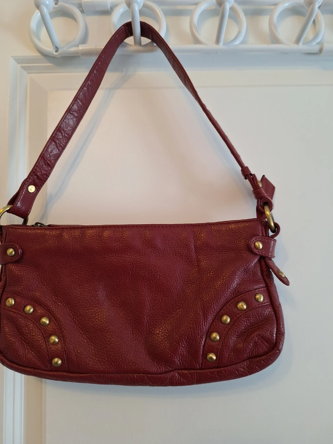 This is a stylish red leather shoulder bag. It's adorned with gold stud detailing on the front. Features a zip closure and an adjustable strap. It's in great shape as it was barely used.