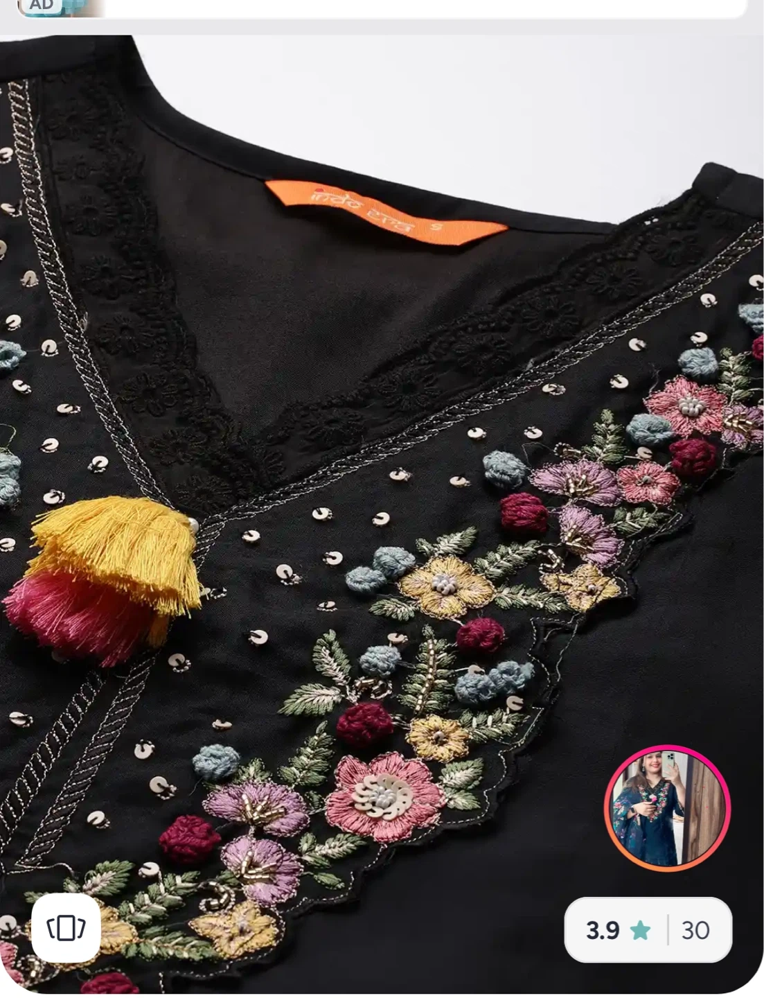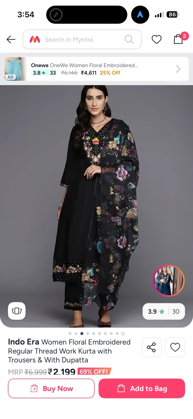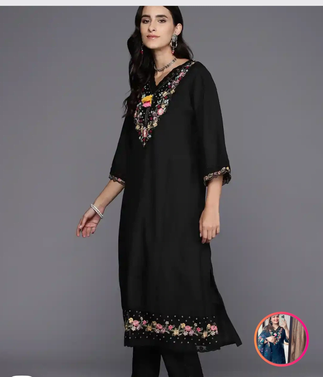 This is a black Indo Era kurta set featuring intricate floral embroidery on the neckline and hem. It includes matching trousers and a printed dupatta. It's a beautiful three-piece outfit.