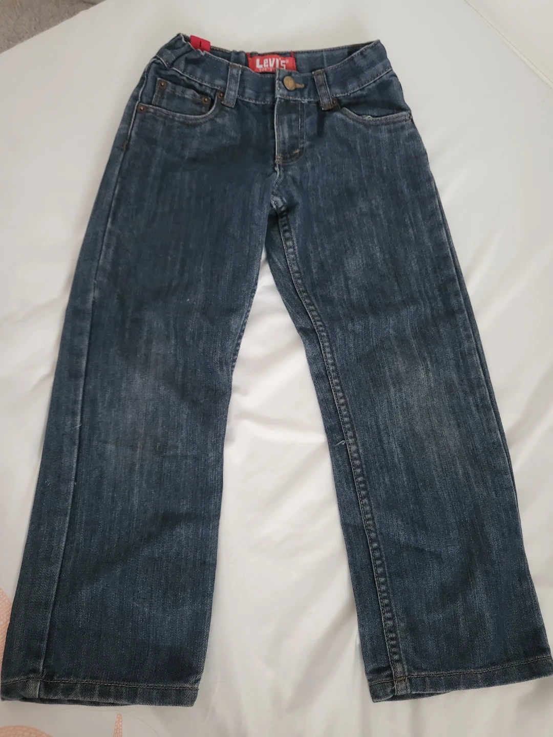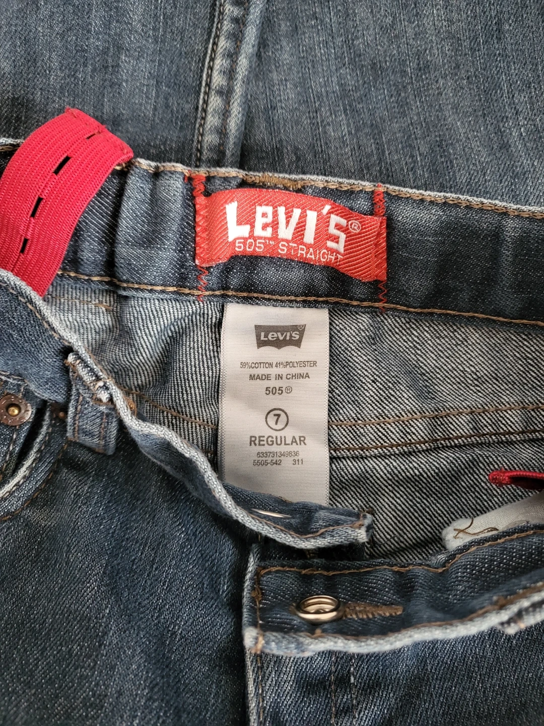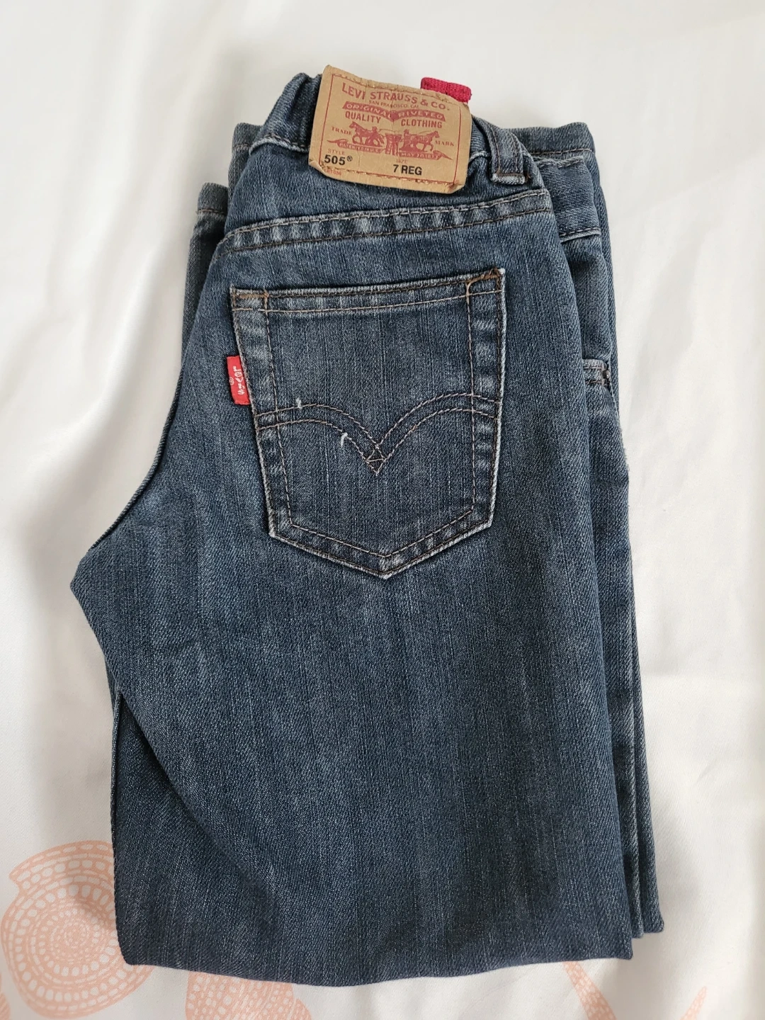 Selling a pair of Levi's 505 straight jeans in size 7 regular. They're in great condition and made of 59% cotton and 41% polyester.