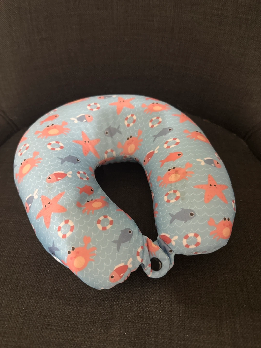 This U-shaped neck pillow features a fun blue print with crabs, starfish, fish, and life preservers. It's soft and comfortable for travel. Its compact size makes it easy to pack for any trip!