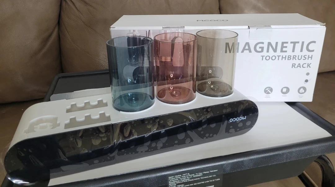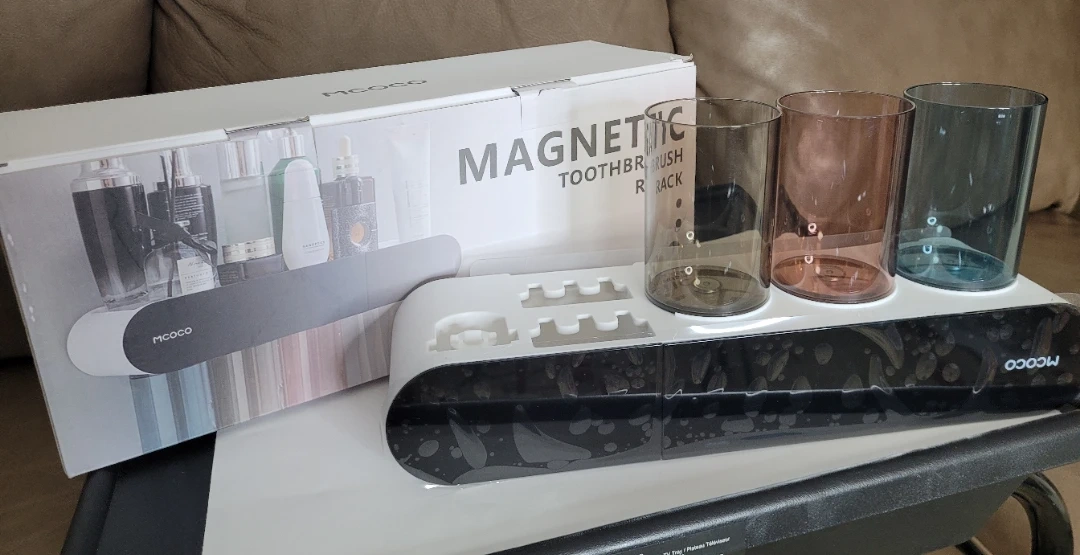 Selling a brand new MCOCO magnetic toothbrush rack, still in its original box! It's a handy way to keep your bathroom organized and your toothbrushes clean. Comes with three cups for rinsing or holding other bathroom essentials. Never been used!