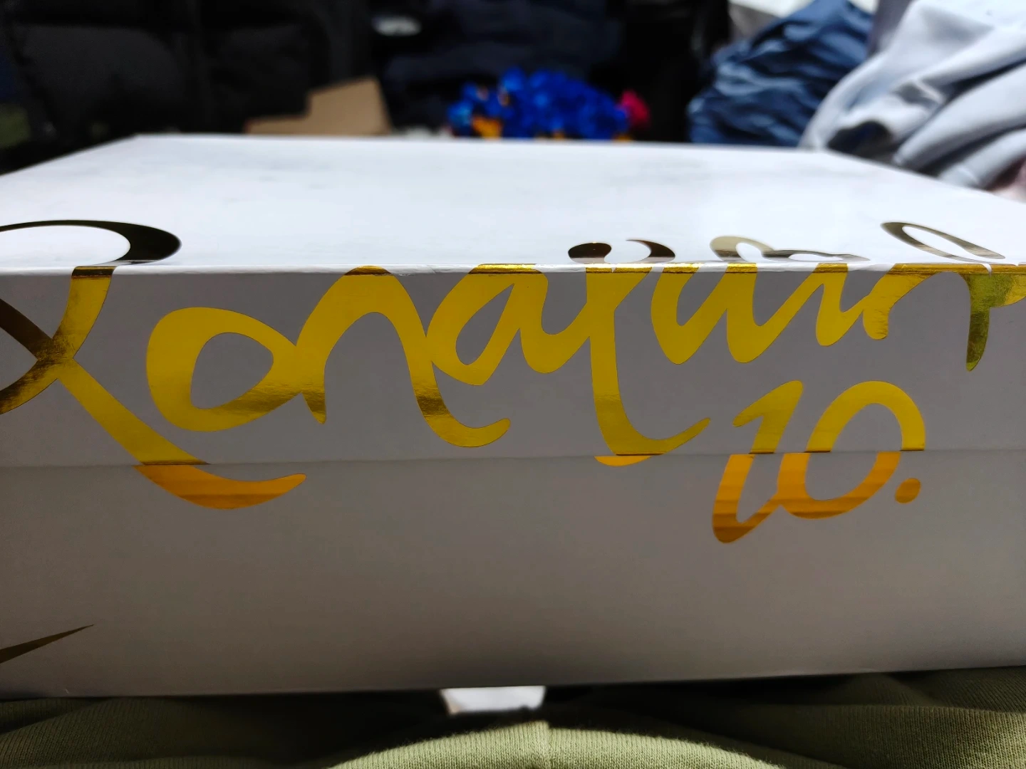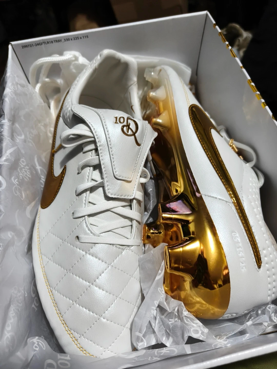 Selling a pair of Nike Tiempo Ronaldinho 10R FG soccer cleats in white and gold. These cleats are brand new in box. They feature the iconic Nike swoosh in gold and the Ronaldinho '10R' logo. The manufacturing date is 2025 May 15.