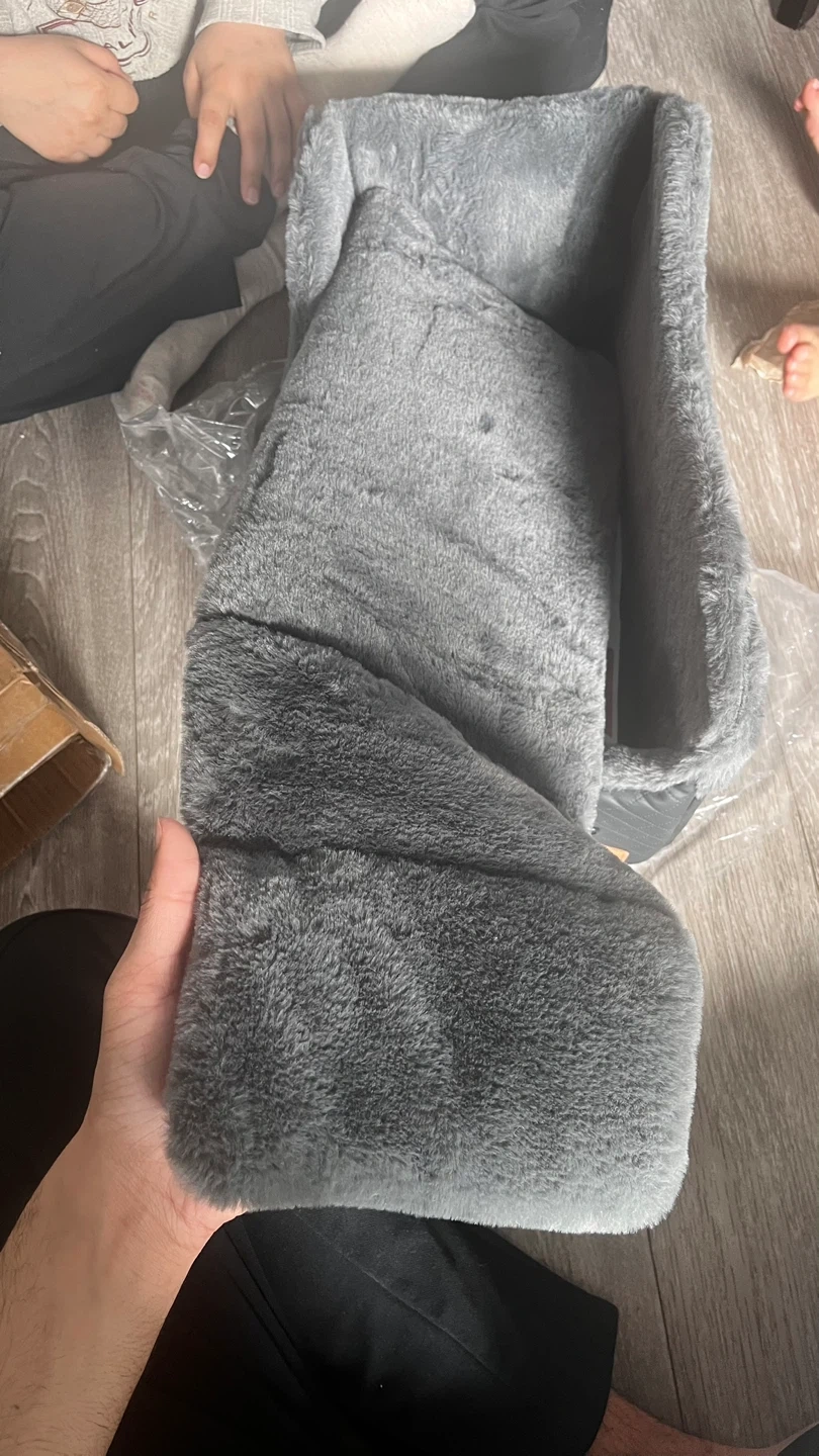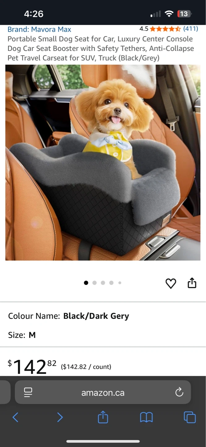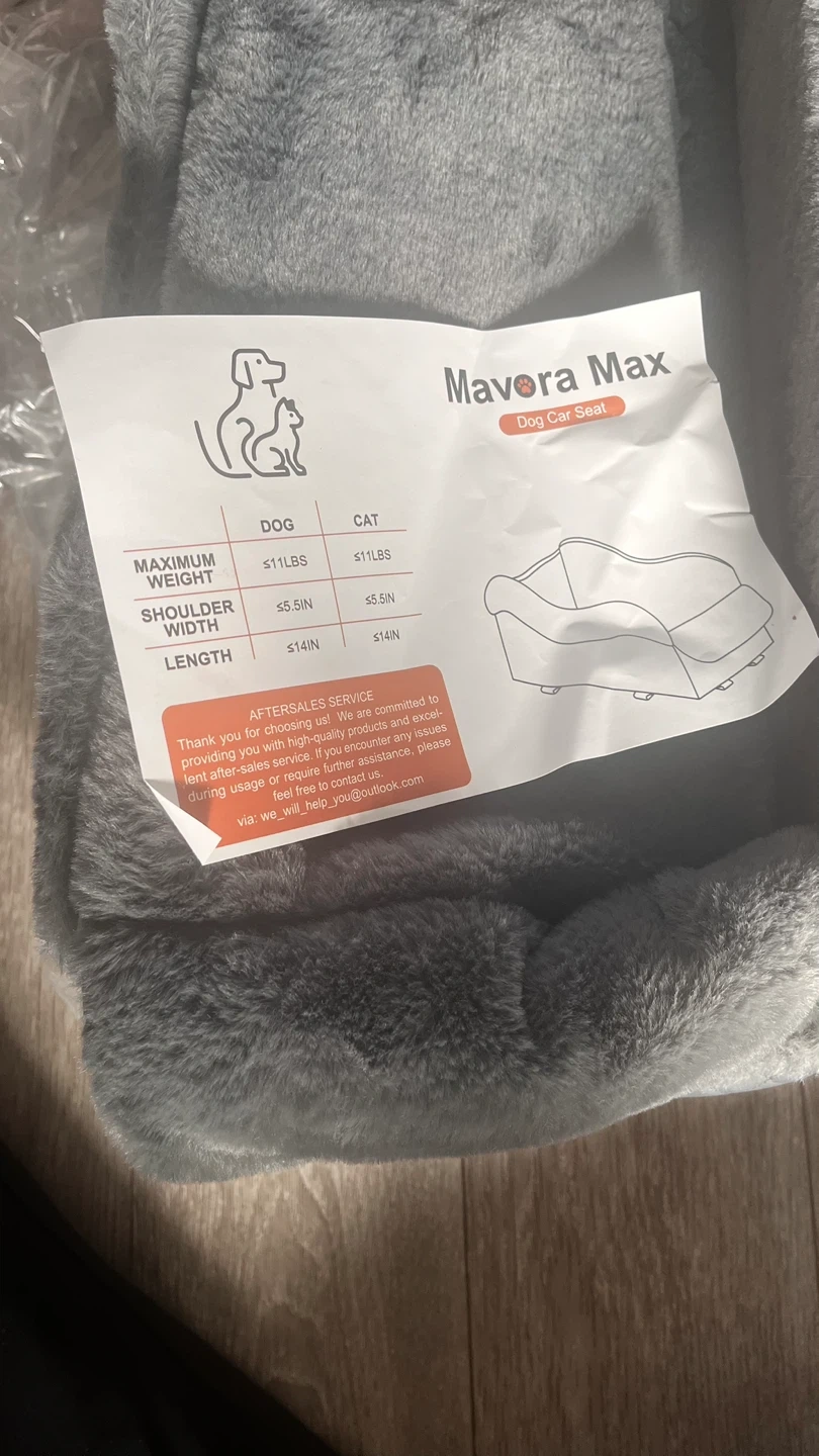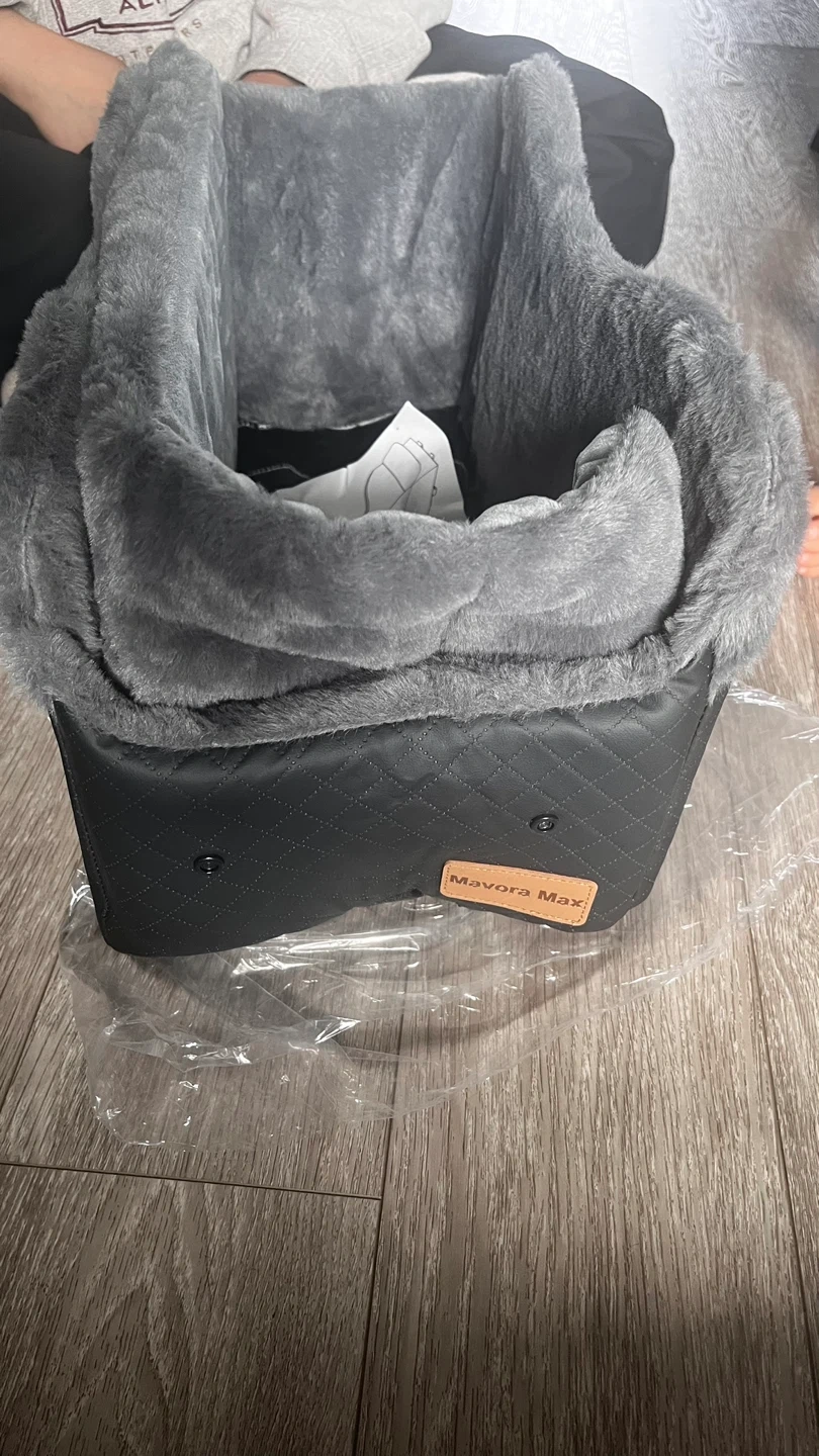 Mavora Max portable small dog car seat booster in Black/Dark Grey. Plush faux fur lining. Includes safety tethers and a removable mat. Supports up to 11lbs for dogs and cats.