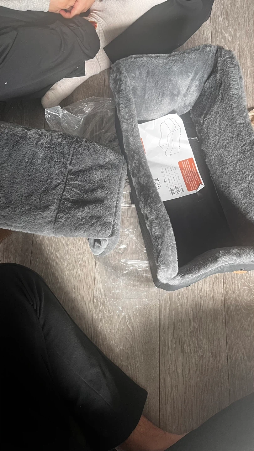 Mavora Max portable small dog car seat booster in Black/Dark Grey. Plush faux fur lining. Includes safety tethers and a removable mat. Supports up to 11lbs for dogs and cats.