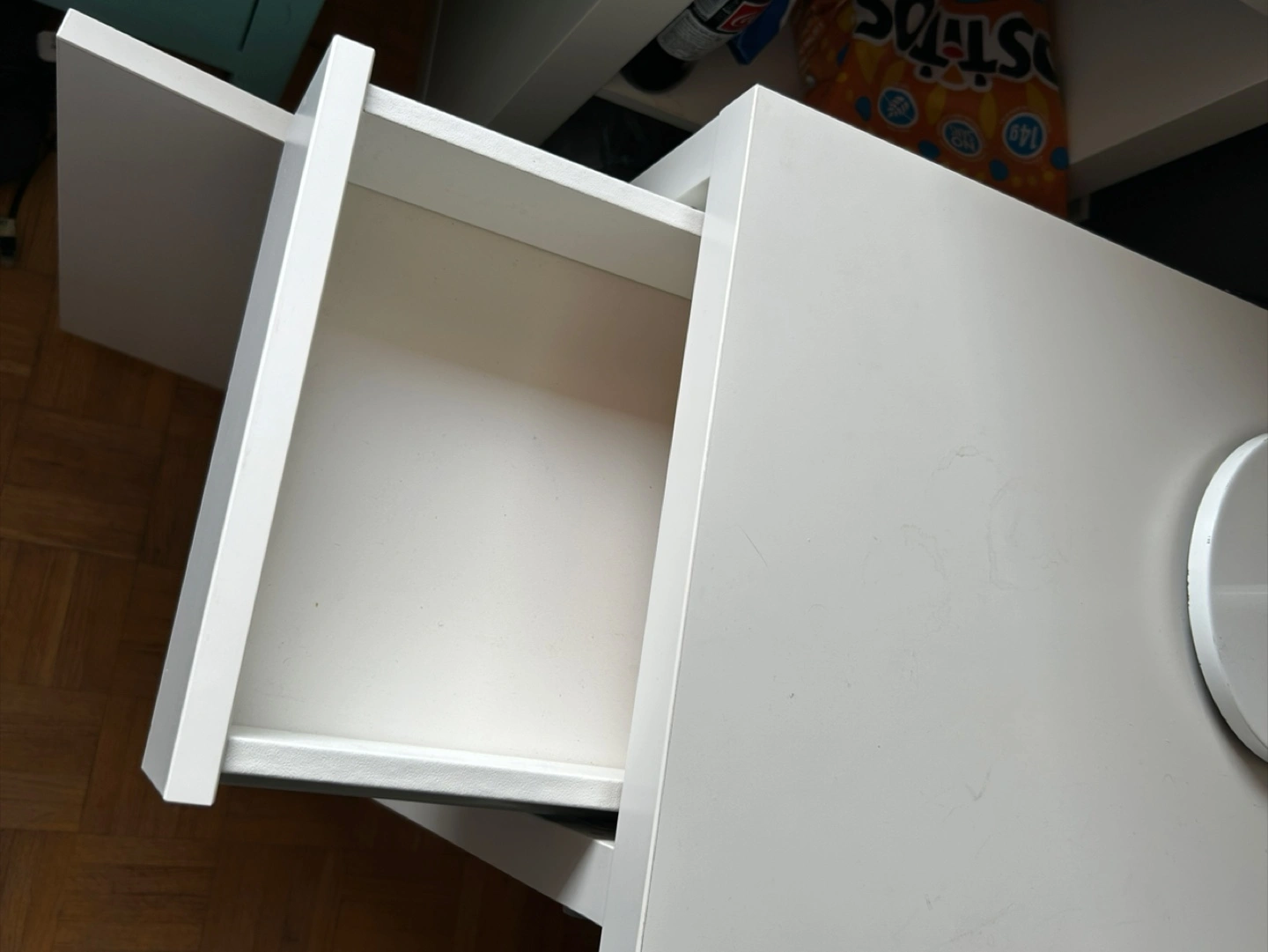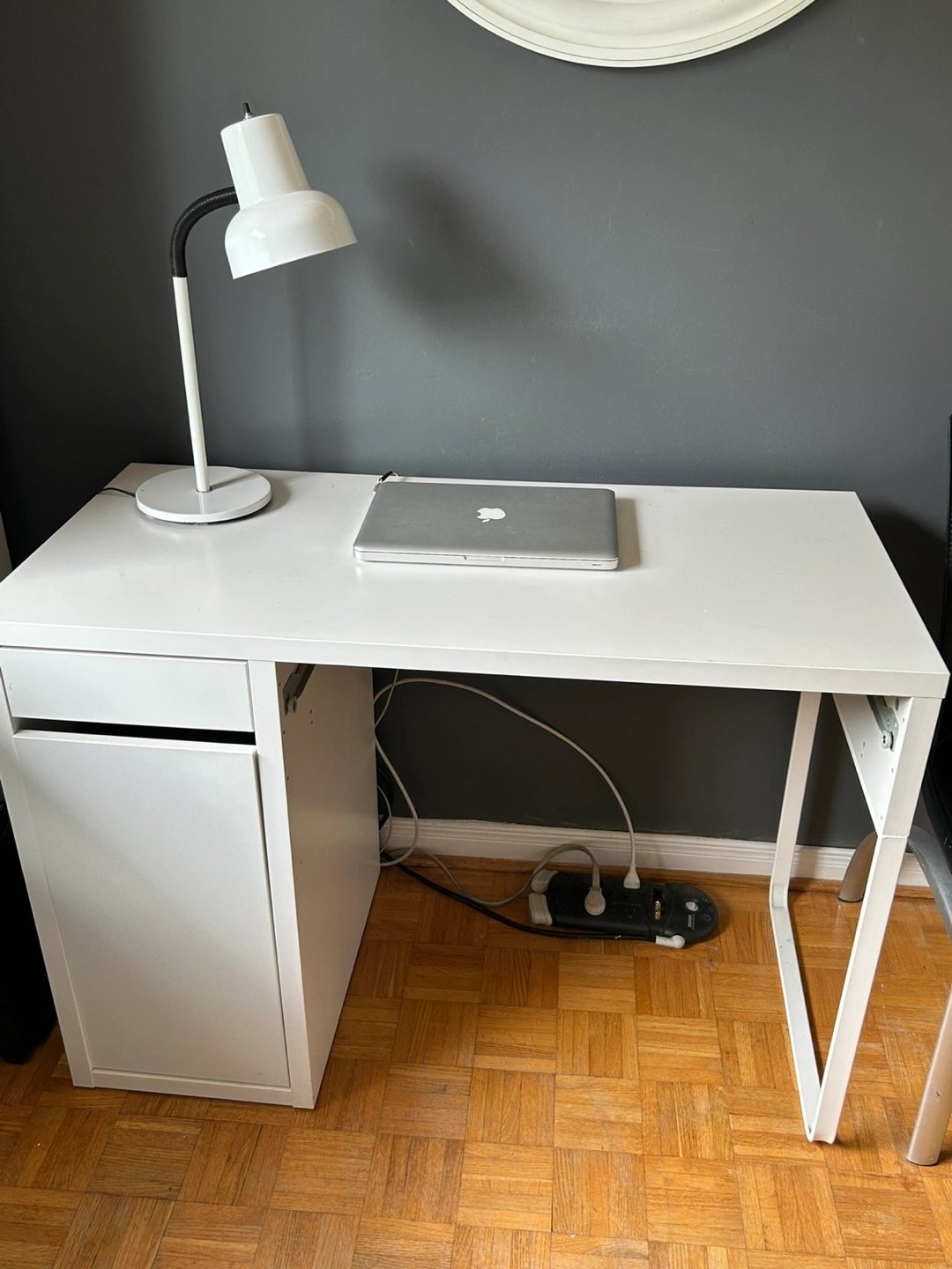 White desk with storage. A pull-out drawer. Features a cabinet with shelves. Made of a smooth, clean material. Perfect for creating a quiet space to work from home.