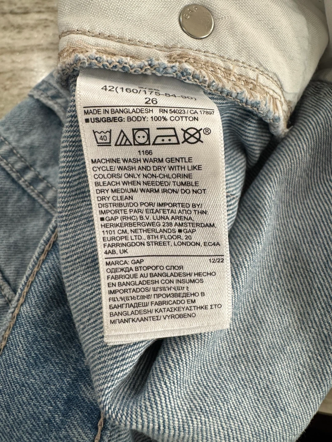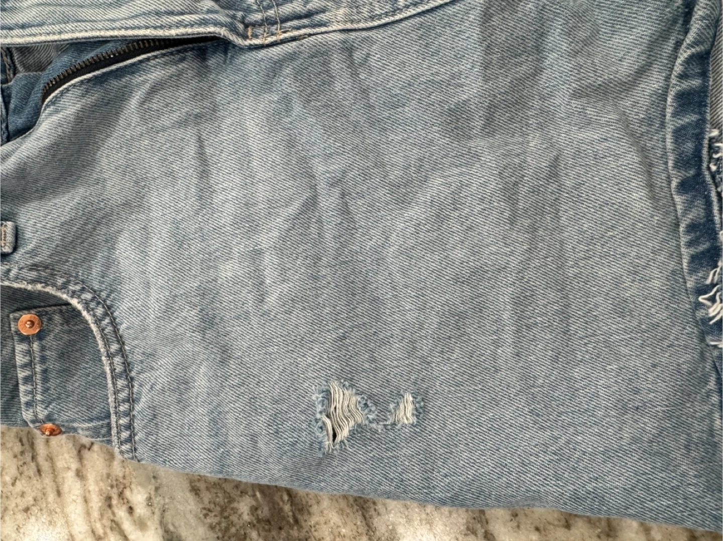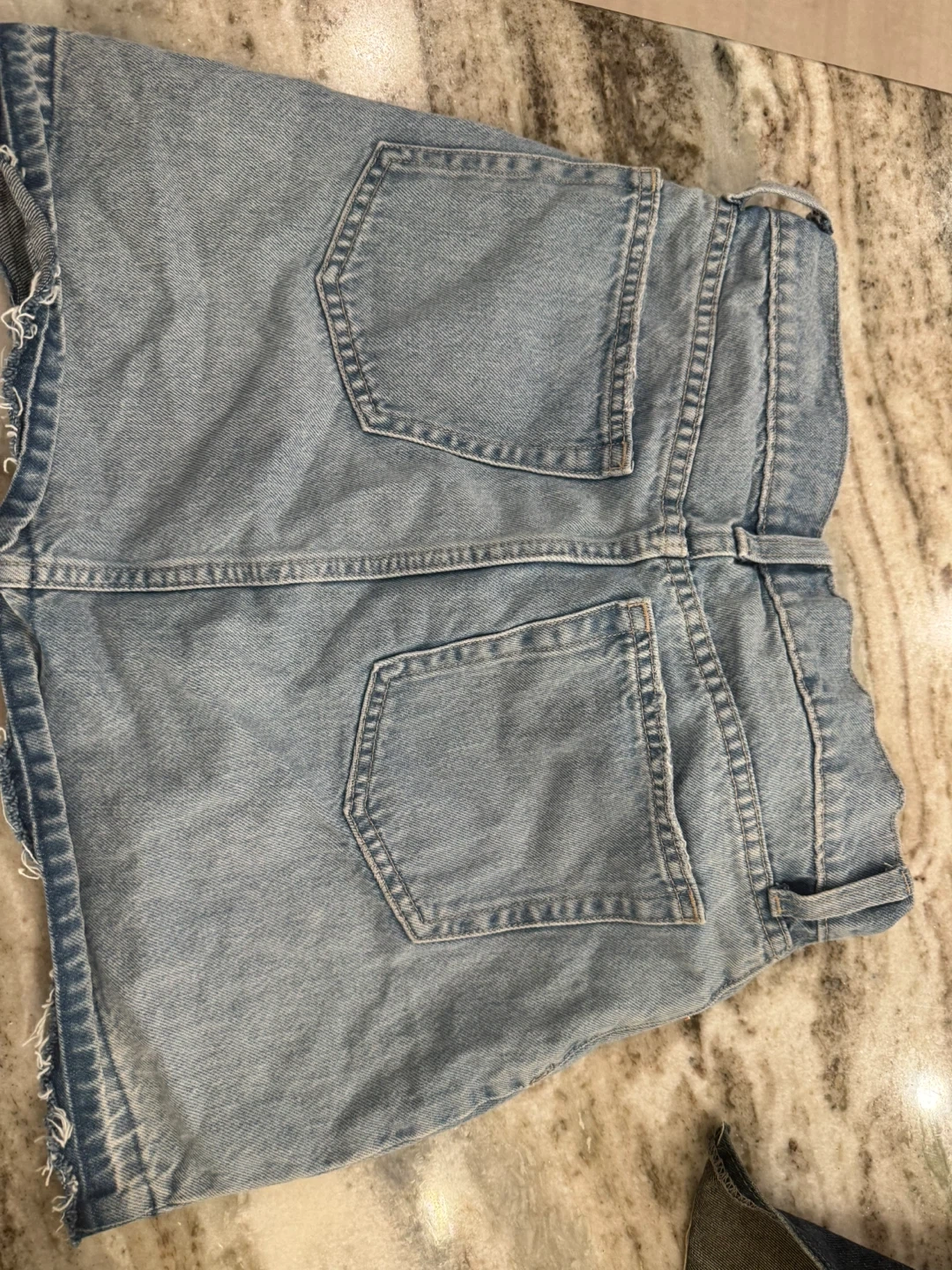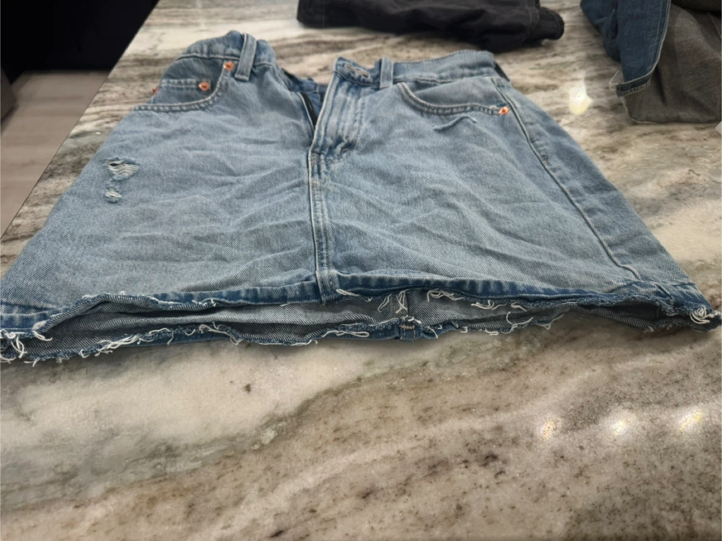 Light wash denim mini skirt from GAP. Features distressed details and a raw hem. Cotton material. Button and zip fly.