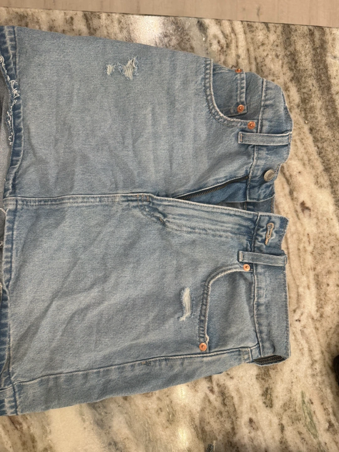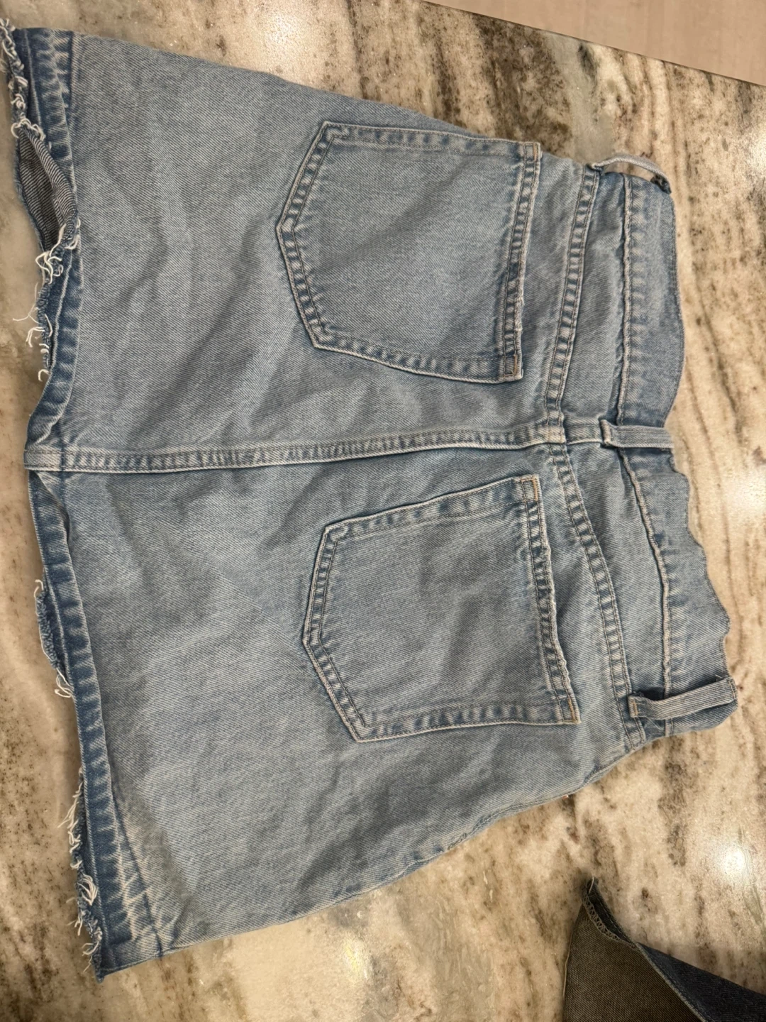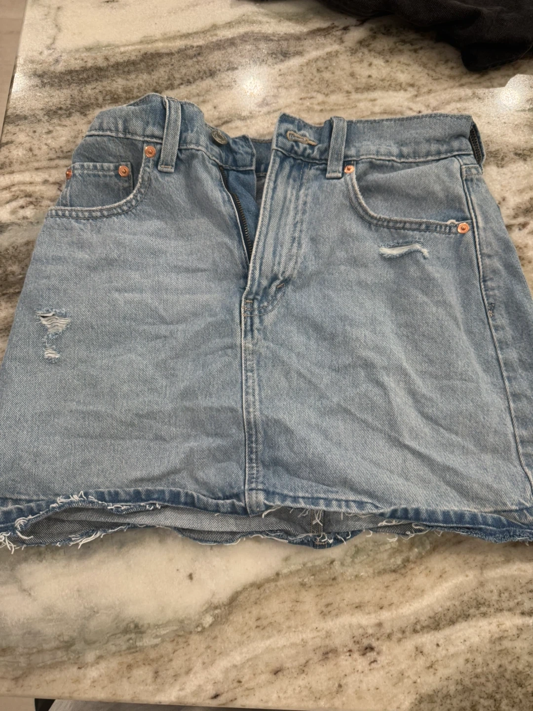 Light wash denim mini skirt from GAP. Features distressed details and a raw hem. Cotton material. Button and zip fly.