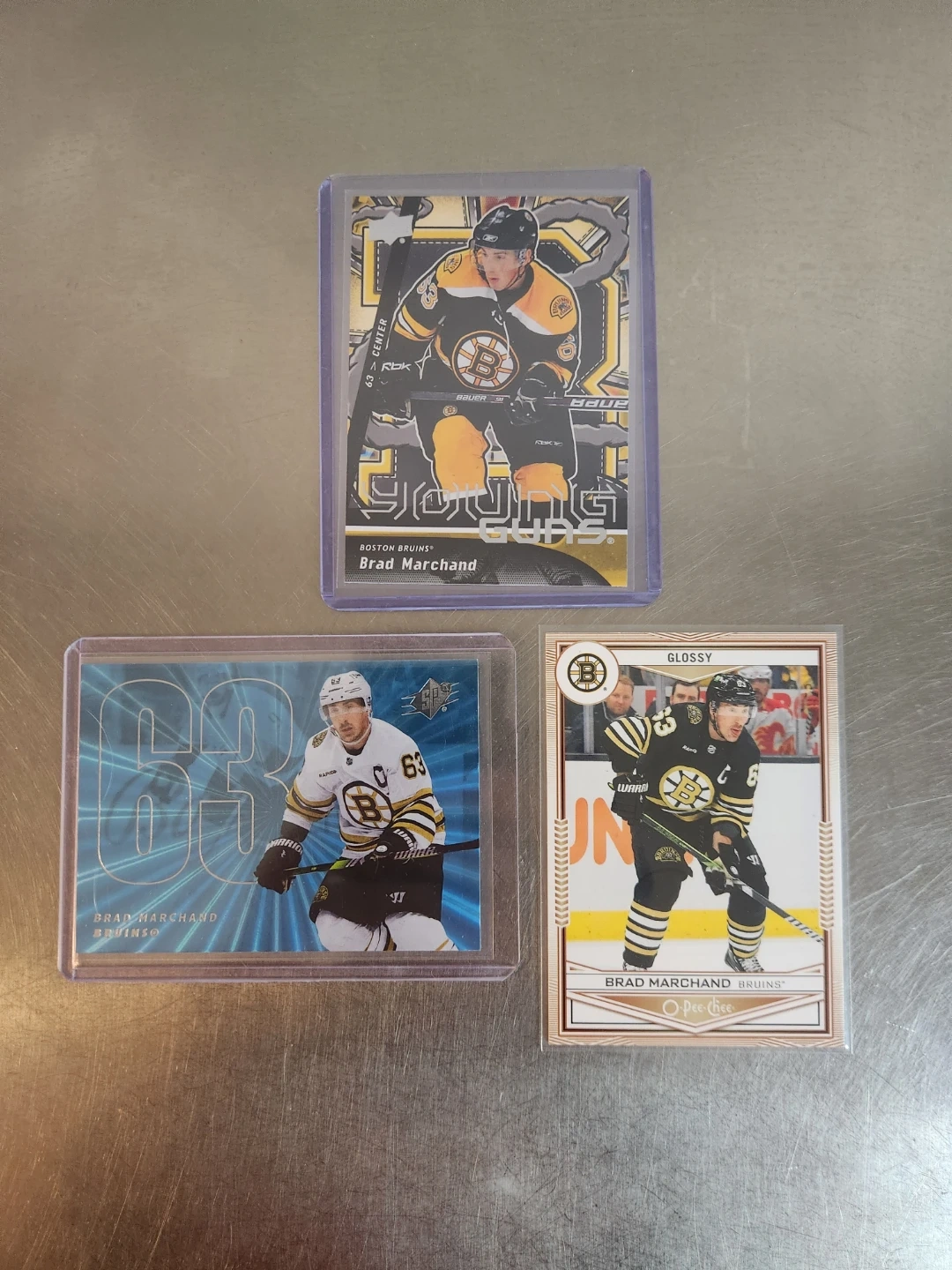 Three hockey cards featuring Brad Marchand of the Boston Bruins. Includes an O-Pee-Chee card and two others.