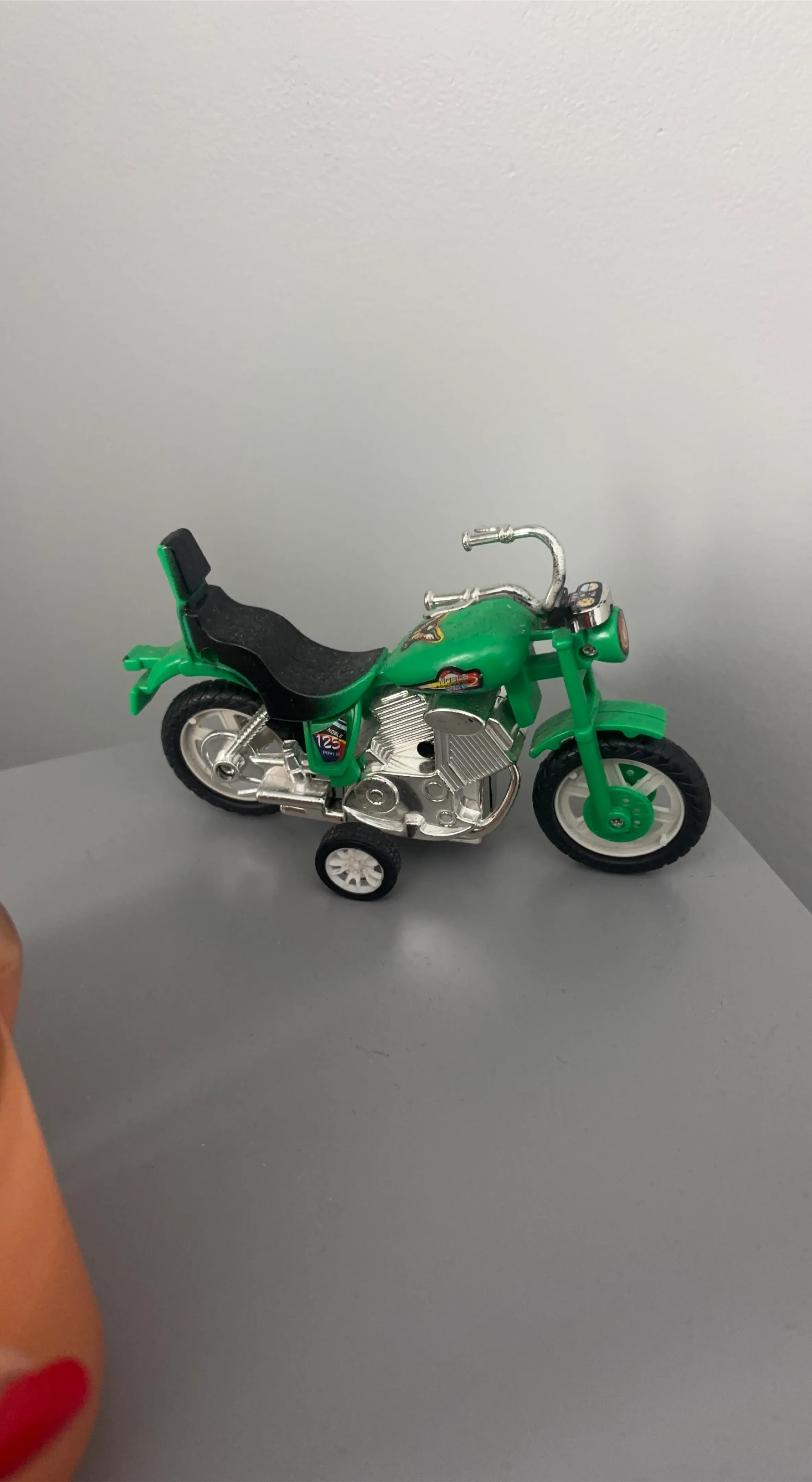 This is a green toy motorcycle with a black seat and silver accents. It has "NOBLE 125 POWER" printed on the side. Includes training wheels.