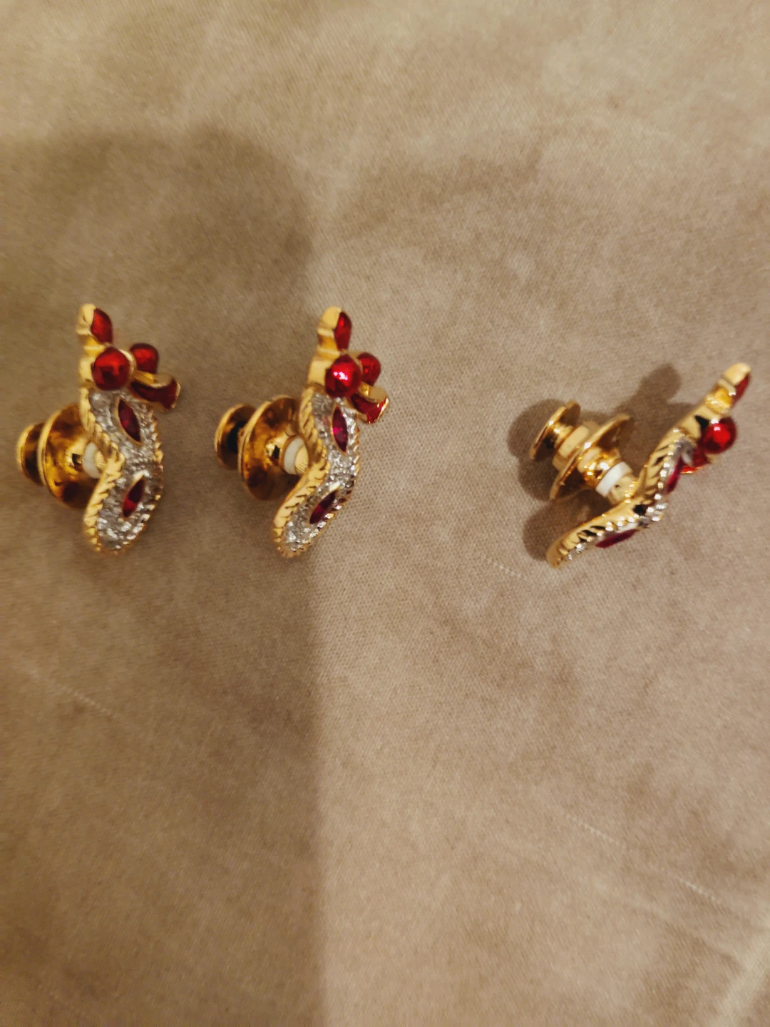 Three gold tone snake-shaped pins. Each pin is adorned with red and clear crystals. These accessories add a unique touch to any outfit!
