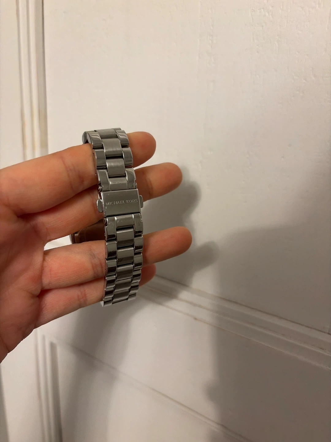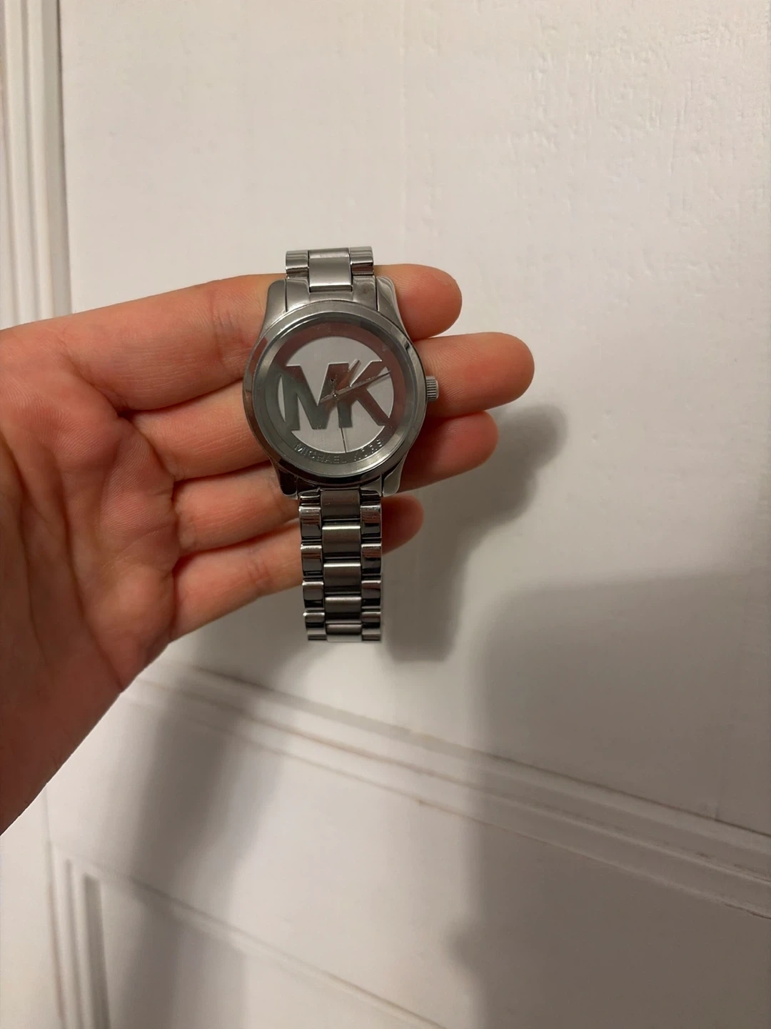 Silver tone Michael Kors watch with MK logo on the face. This watch has a stainless steel band. It's a classic timepiece.