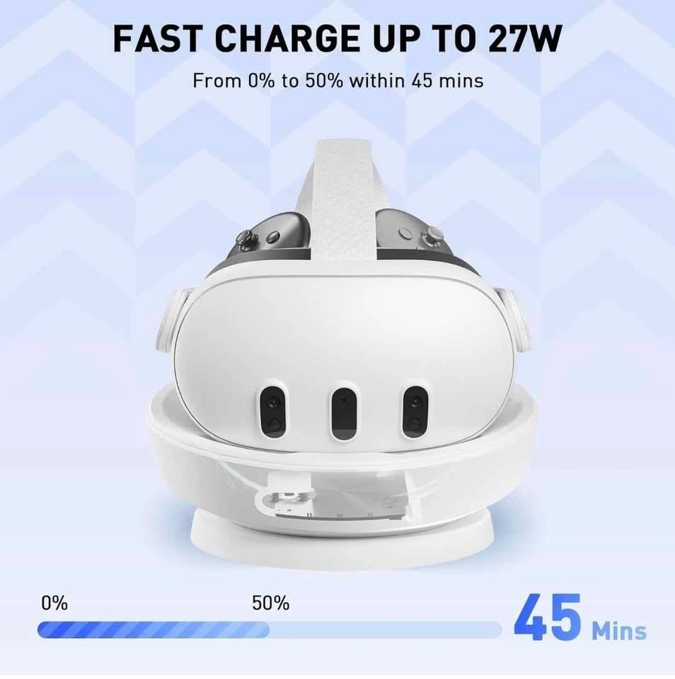 Efficient PRISMXR Carina D1 magnetic charging dock for Meta Quest 3. Super easy drop-and-charge, no fumbling. Fast charge up to 27W, gets you to 50% in about 45 mins. Space-saving design, keeps your VR setup tidy. Works with original, elite, and halo straps. Has built-in protection for over voltage, charge, discharge, and power. Not compatible with Quest 3S.