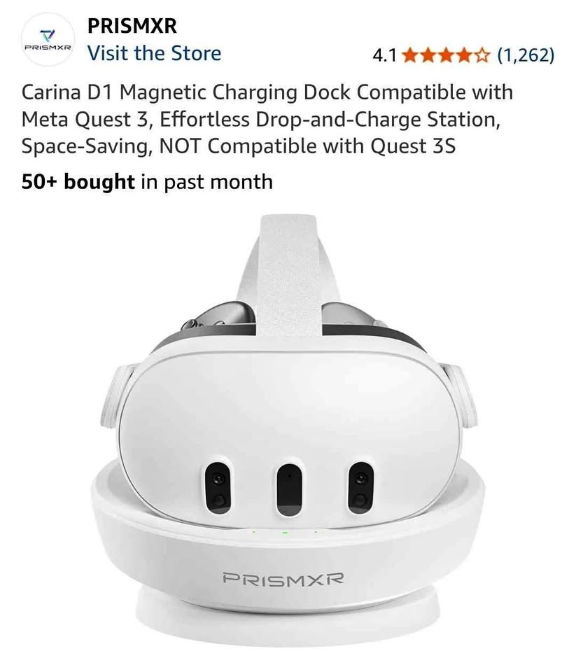 Efficient PRISMXR Carina D1 magnetic charging dock for Meta Quest 3. Super easy drop-and-charge, no fumbling. Fast charge up to 27W, gets you to 50% in about 45 mins. Space-saving design, keeps your VR setup tidy. Works with original, elite, and halo straps. Has built-in protection for over voltage, charge, discharge, and power. Not compatible with Quest 3S.