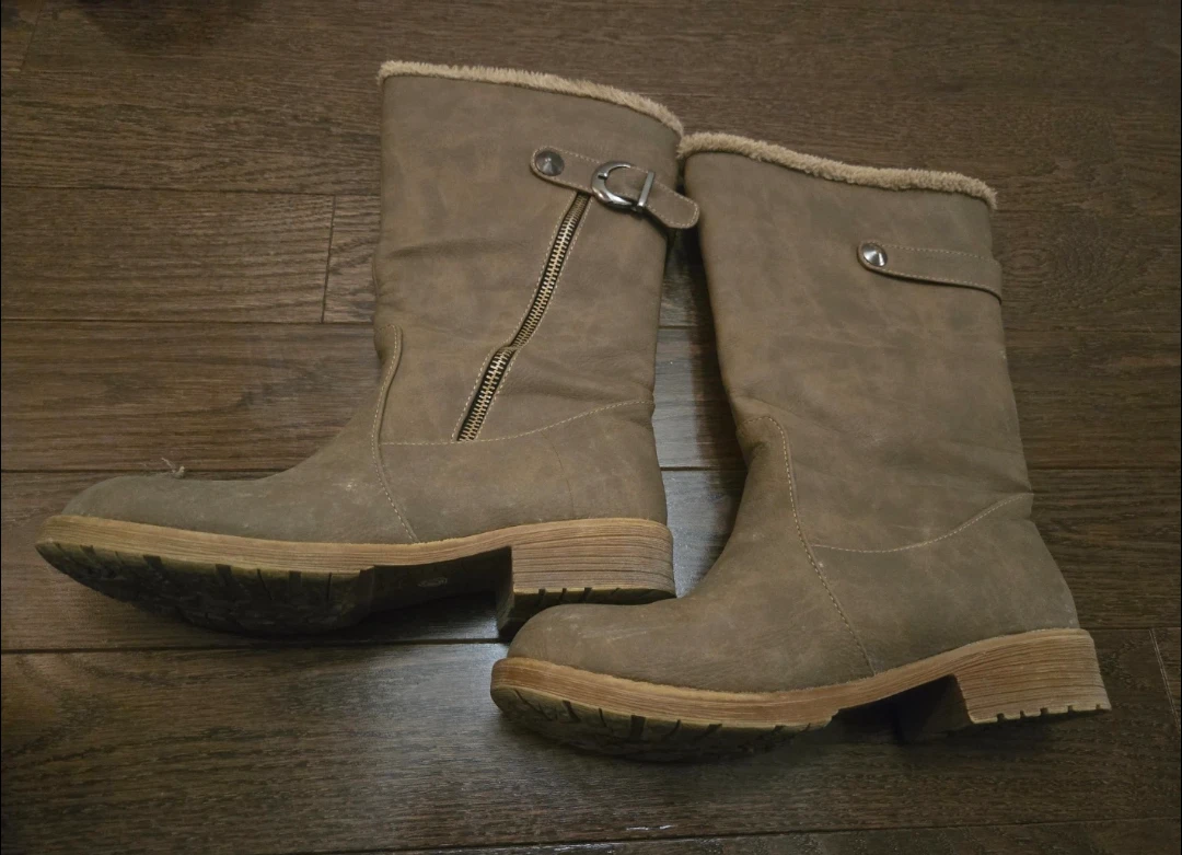 Cozy faux suede boots lined with soft fur for warmth. They feature a side zipper and buckle detail. Perfect for keeping your feet toasty on chilly days! Receive as a gift and worn twice but too big.