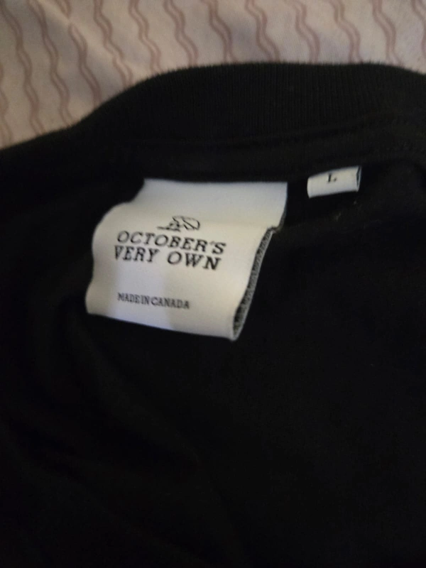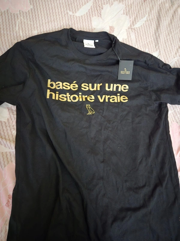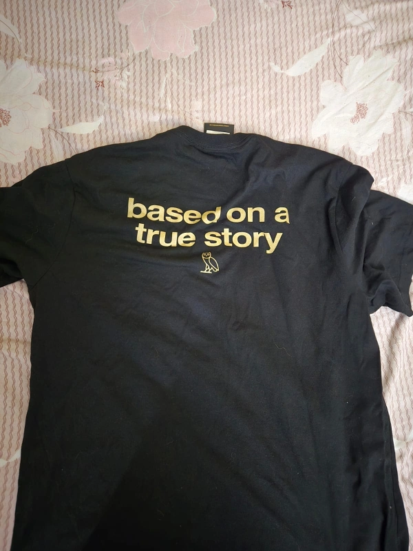 Selling an October's Very Own (OVO) short-sleeved t-shirt in black with gold lettering. The shirt is size large and features the phrase "based on a true story" in English and French. Originally bought for $58.00