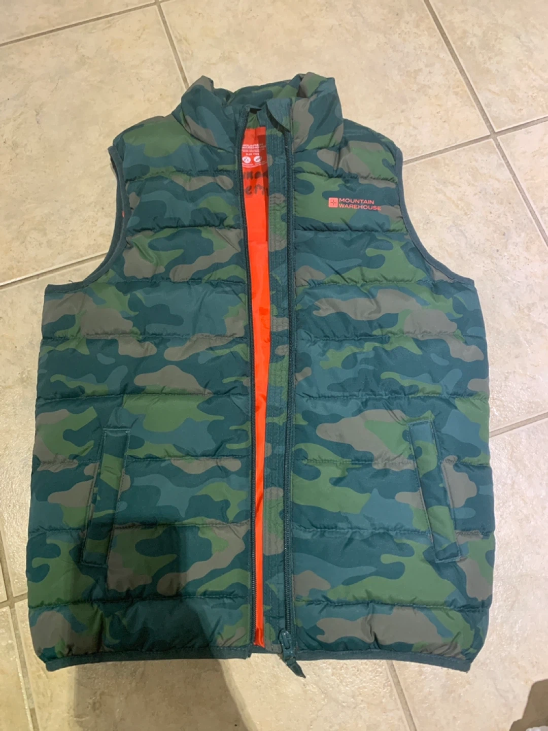 This Mountain Warehouse vest features a fun green camouflage pattern with a bright orange lining. It's a puffer style, perfect for layering on cooler days. Size is youth 9-10.