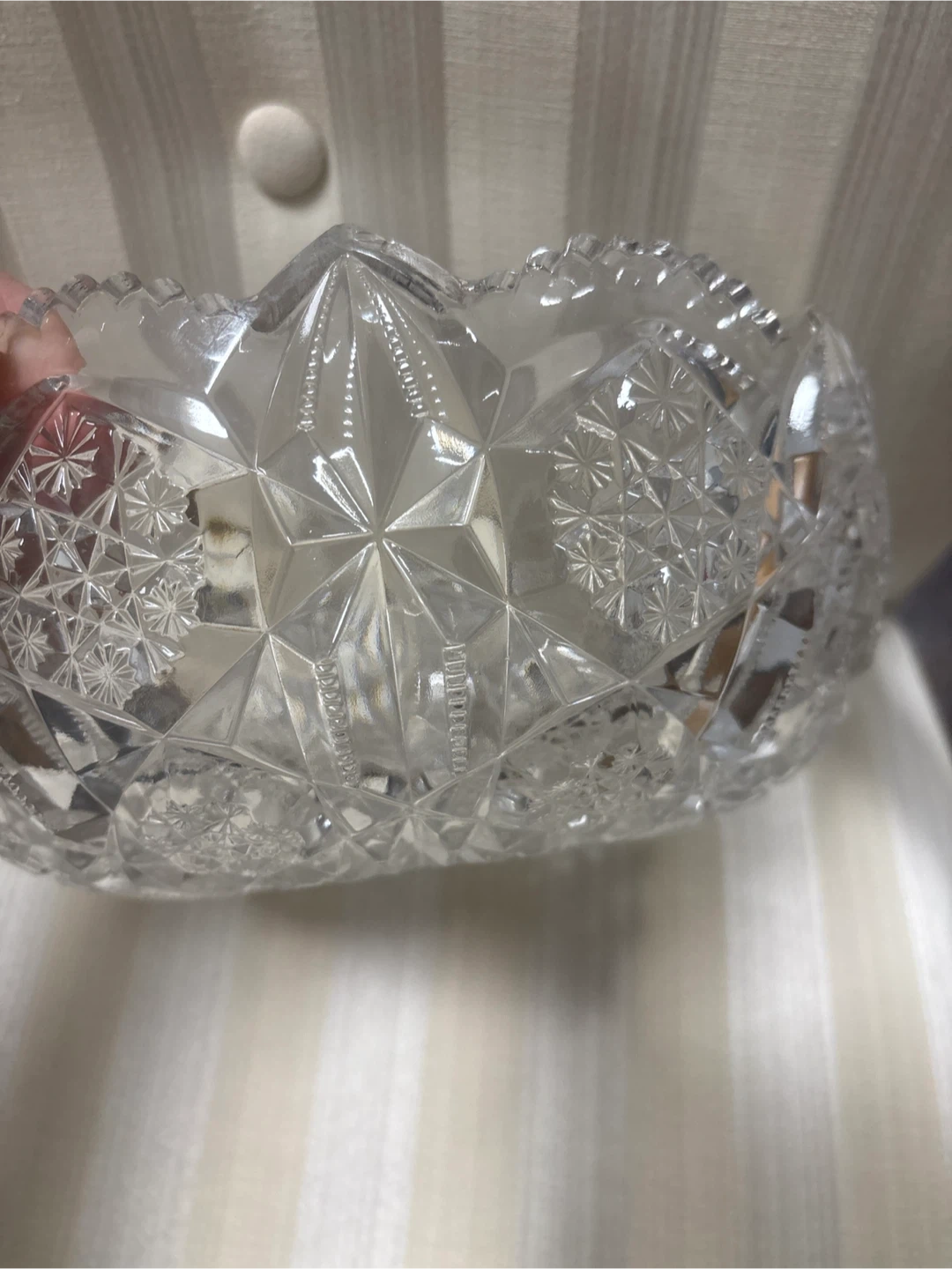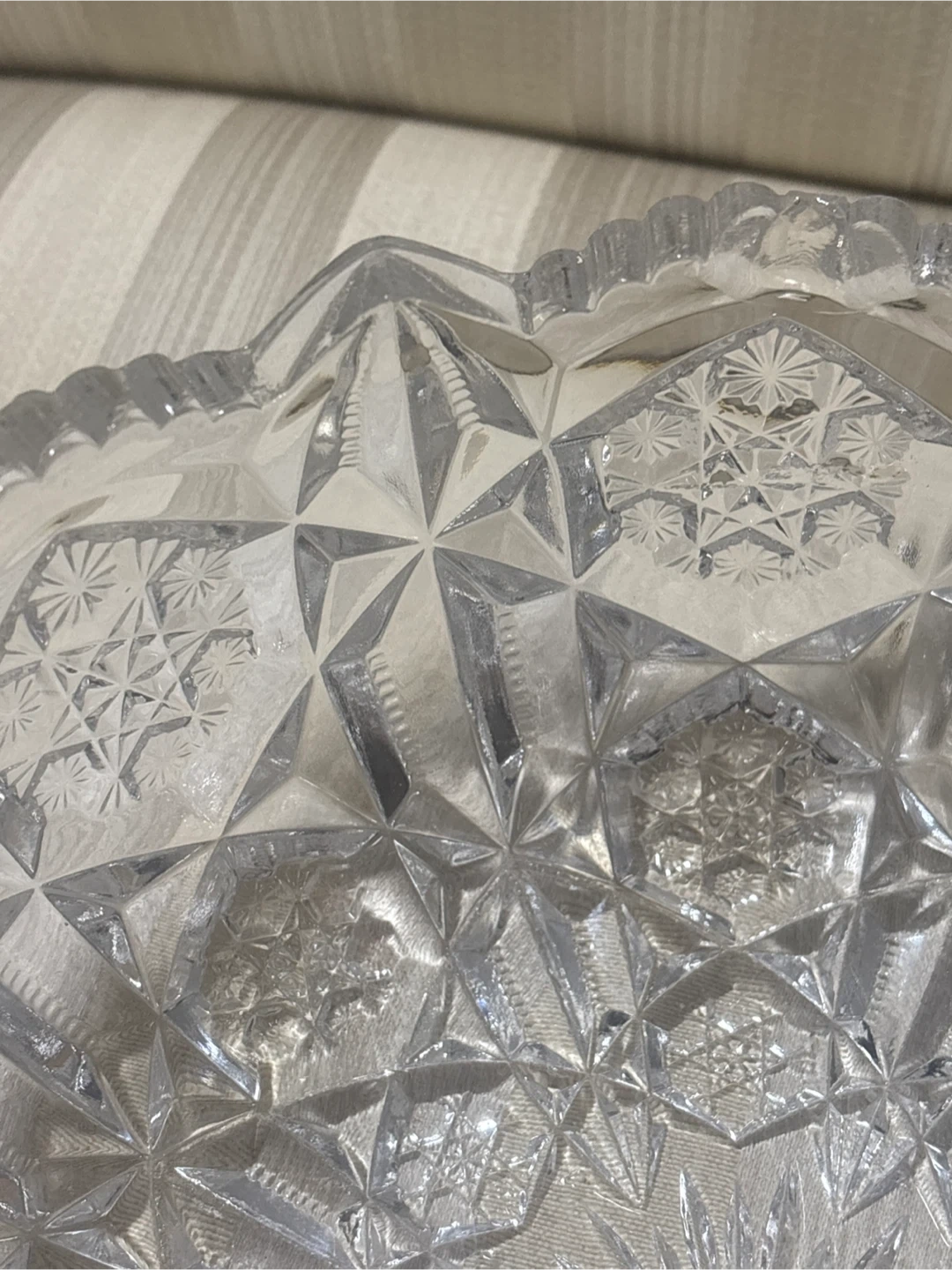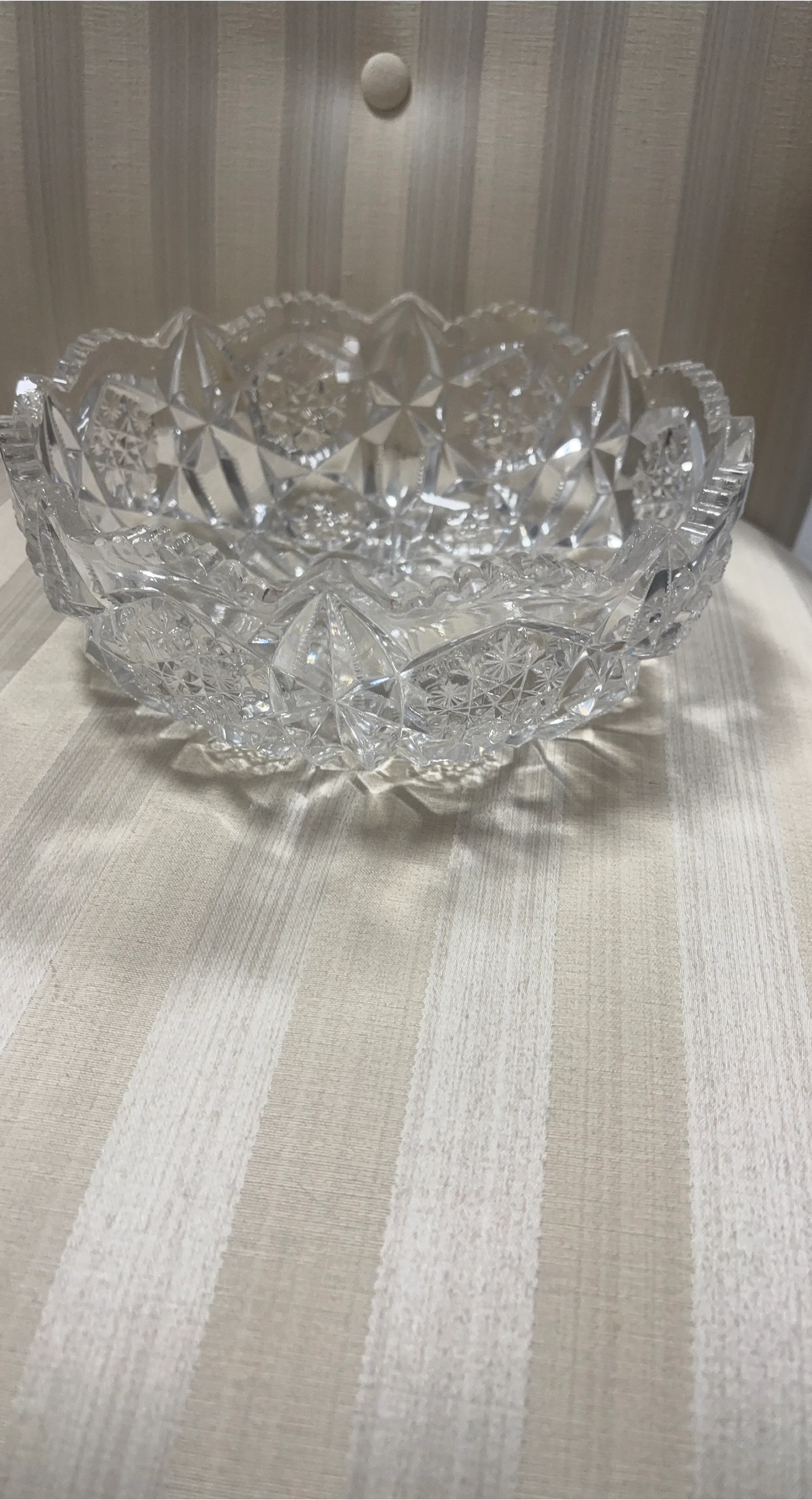 This is a beautiful, clear crystal glass serving bowl. It features intricate, cut glass patterns all around and on the base. Perfect for displaying fruit or serving snacks!