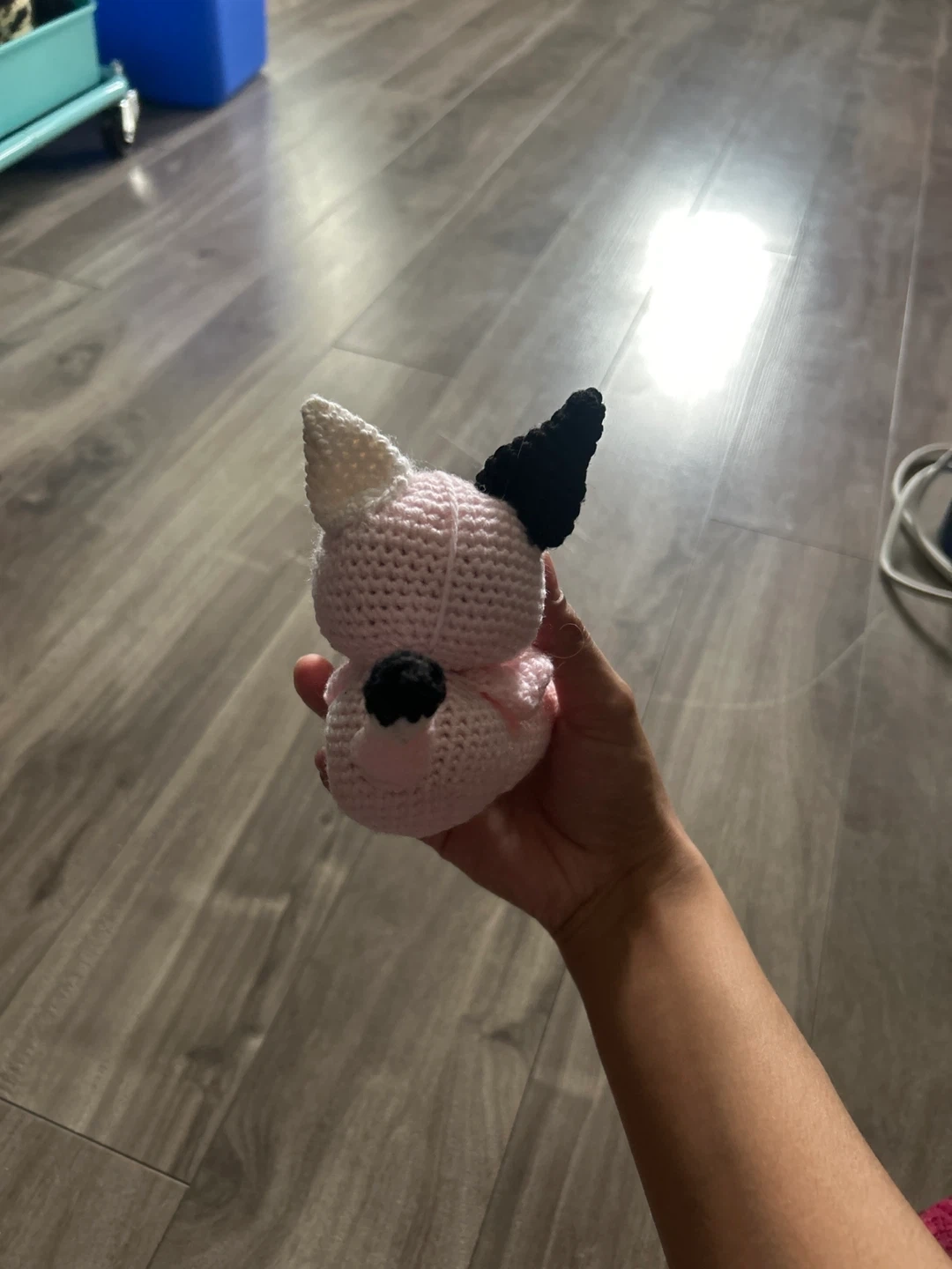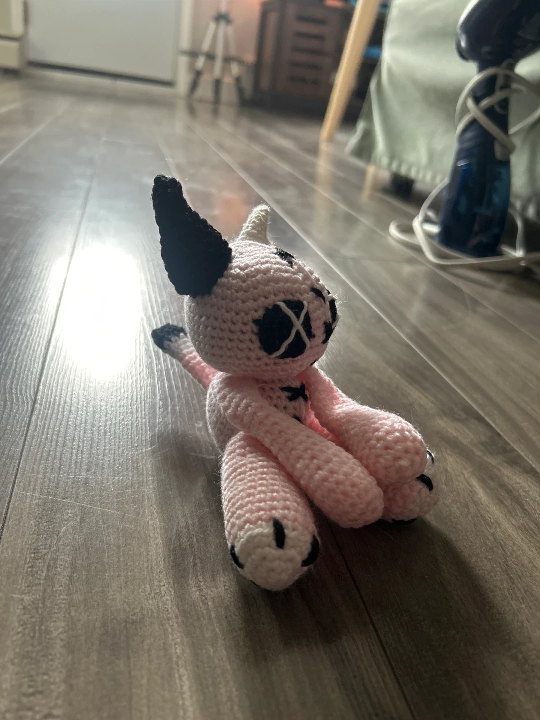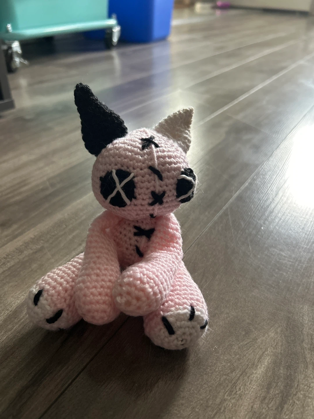This is a cute pink crochet cat plush toy with black accents. It's soft and handmade, perfect for adding a quirky touch to any room. Its unique design makes it a fun decorative piece.