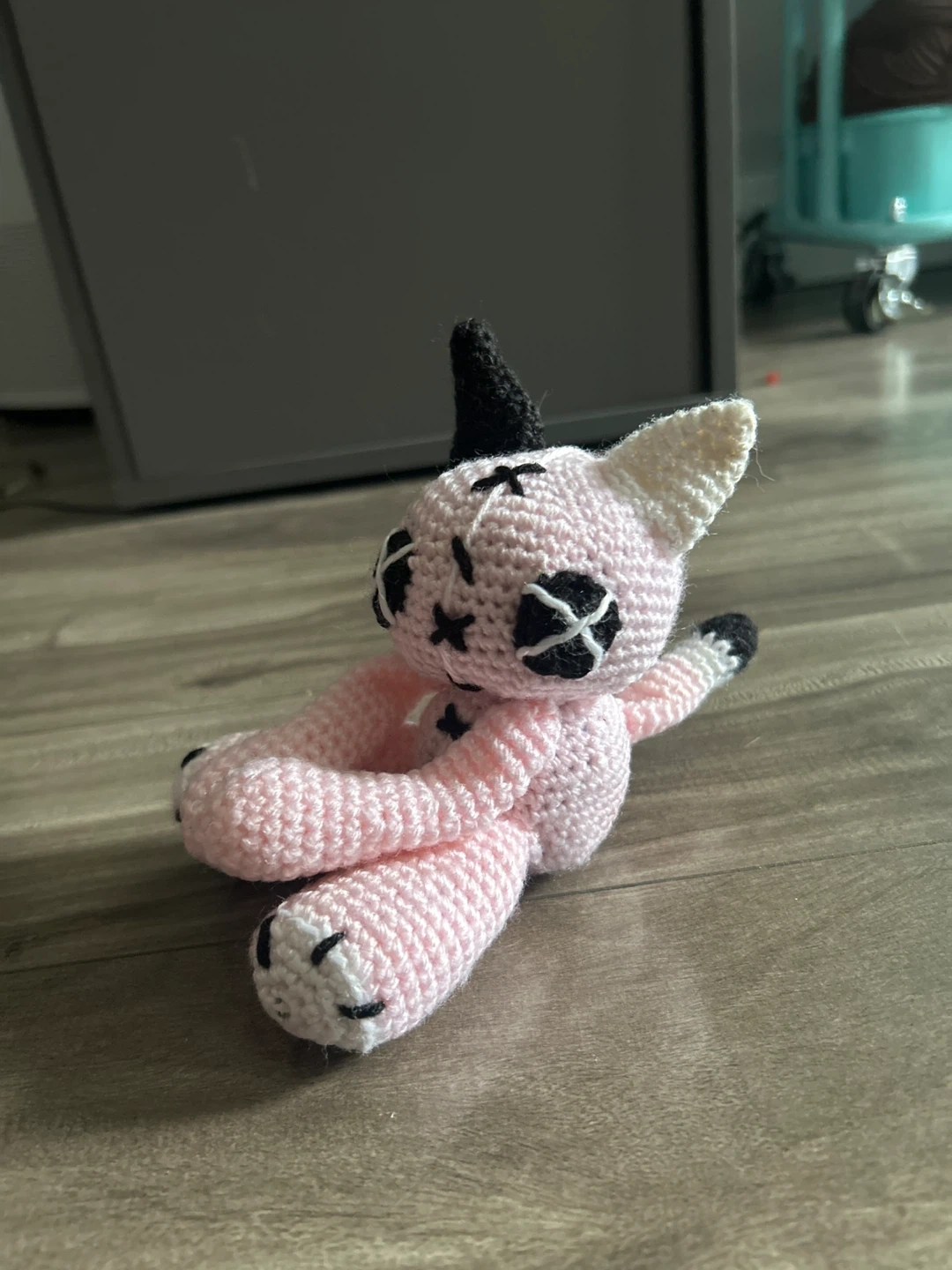 This is a cute pink crochet cat plush toy with black accents. It's soft and handmade, perfect for adding a quirky touch to any room. Its unique design makes it a fun decorative piece.