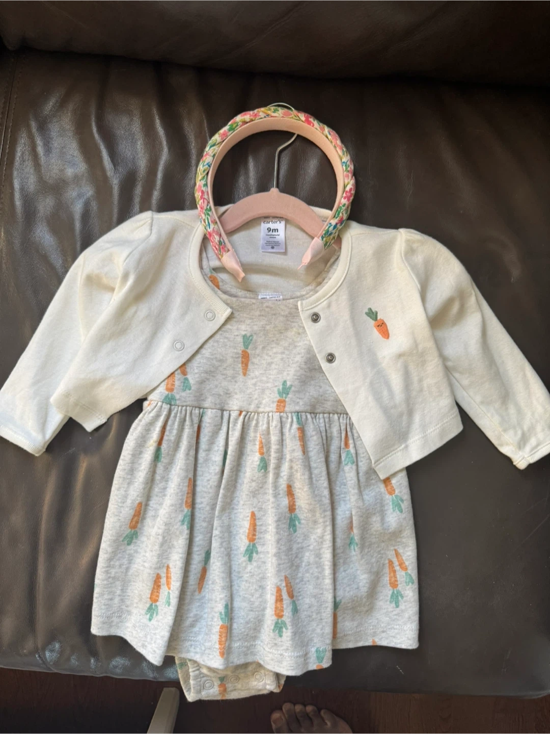 This adorable Carter's outfit features a light grey romper-dress with a playful all-over carrot print. It's paired with a cream-coloured long-sleeved cardigan. The set includes a floral headband for a complete look. Size is 9 months.