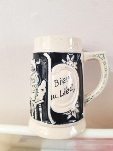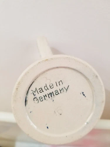 Vintage German 1/8L small ceramic decorative beer mug with festive painting. Made in Germany. Measures 1/8L. Stamped with '6' on the underside and '1/8L' on the side. In great condition with no evident damage. Feel free to message if you have any questions!