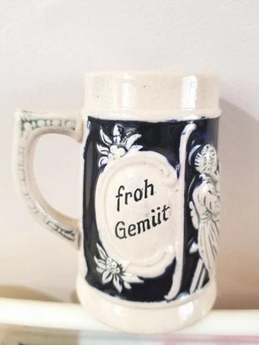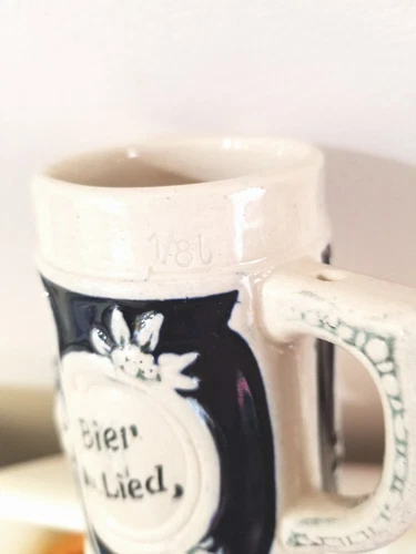 Vintage German 1/8L small ceramic decorative beer mug with festive painting. Made in Germany. Measures 1/8L. Stamped with '6' on the underside and '1/8L' on the side. In great condition with no evident damage. Feel free to message if you have any questions!