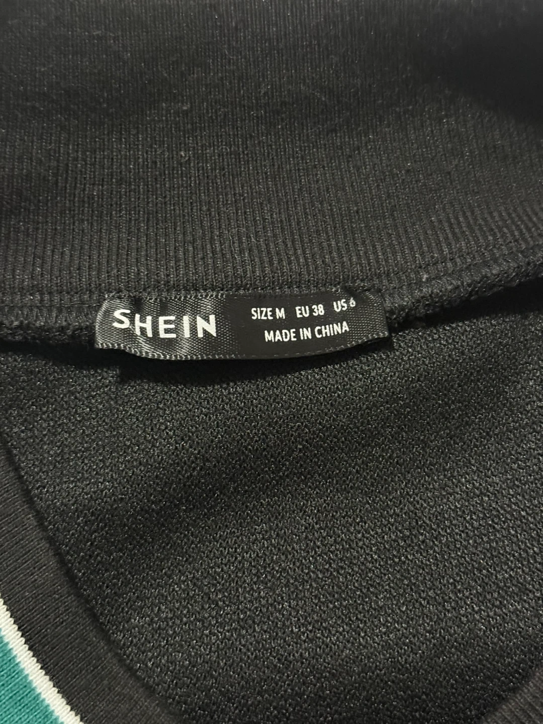 Shein black varsity jacket, in great condition! It has green accents and faux leather sleeves.
