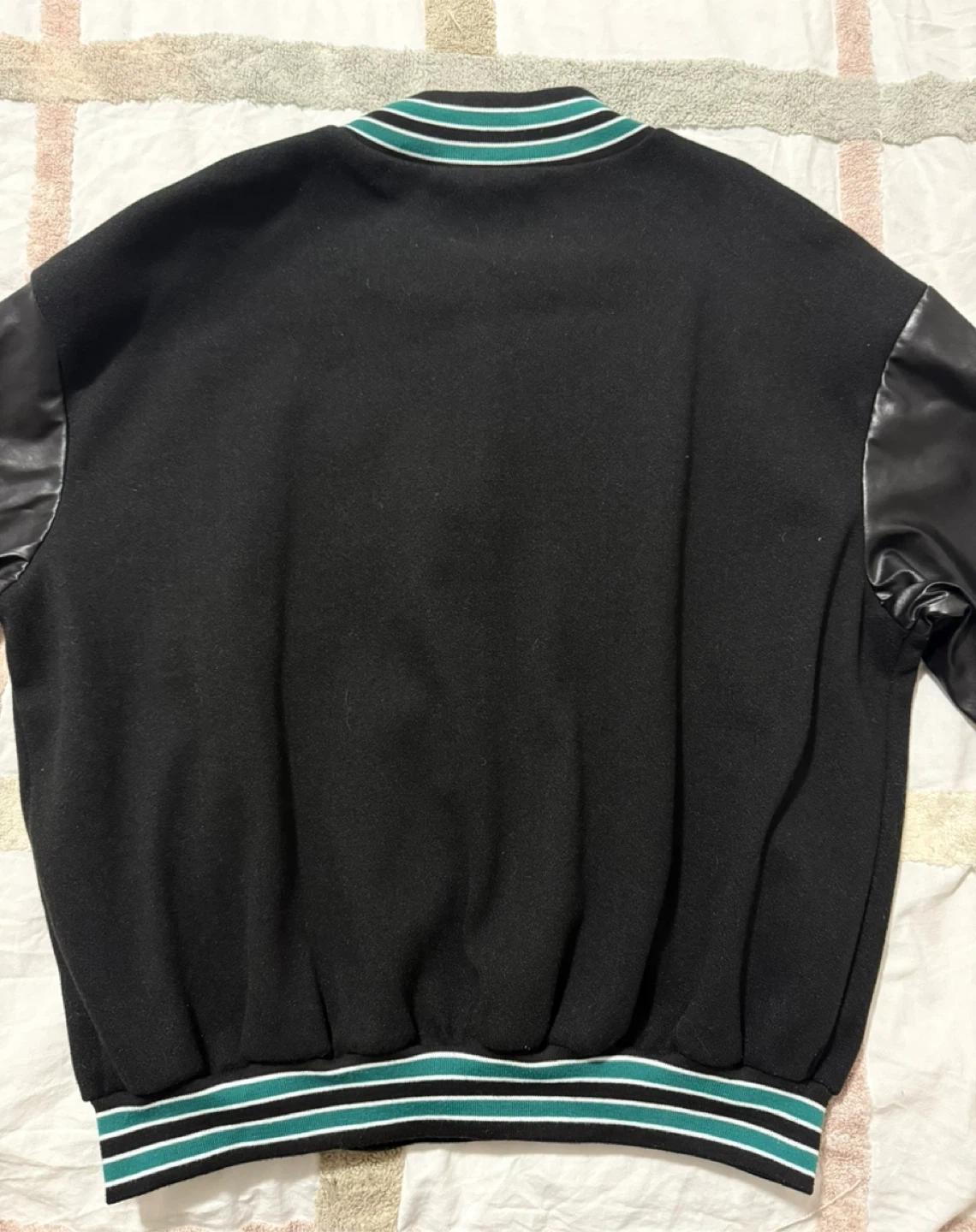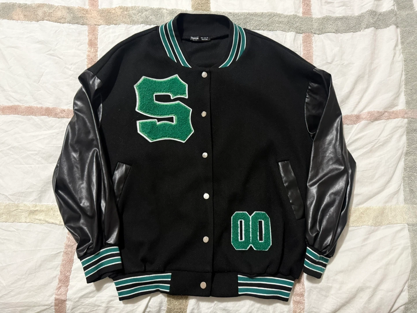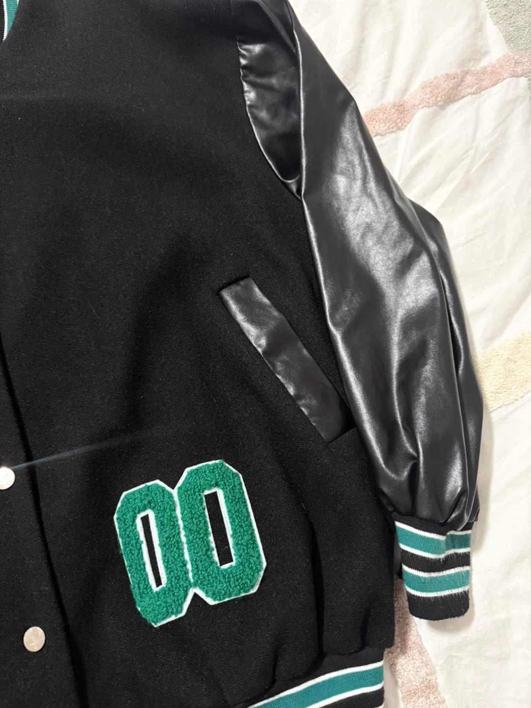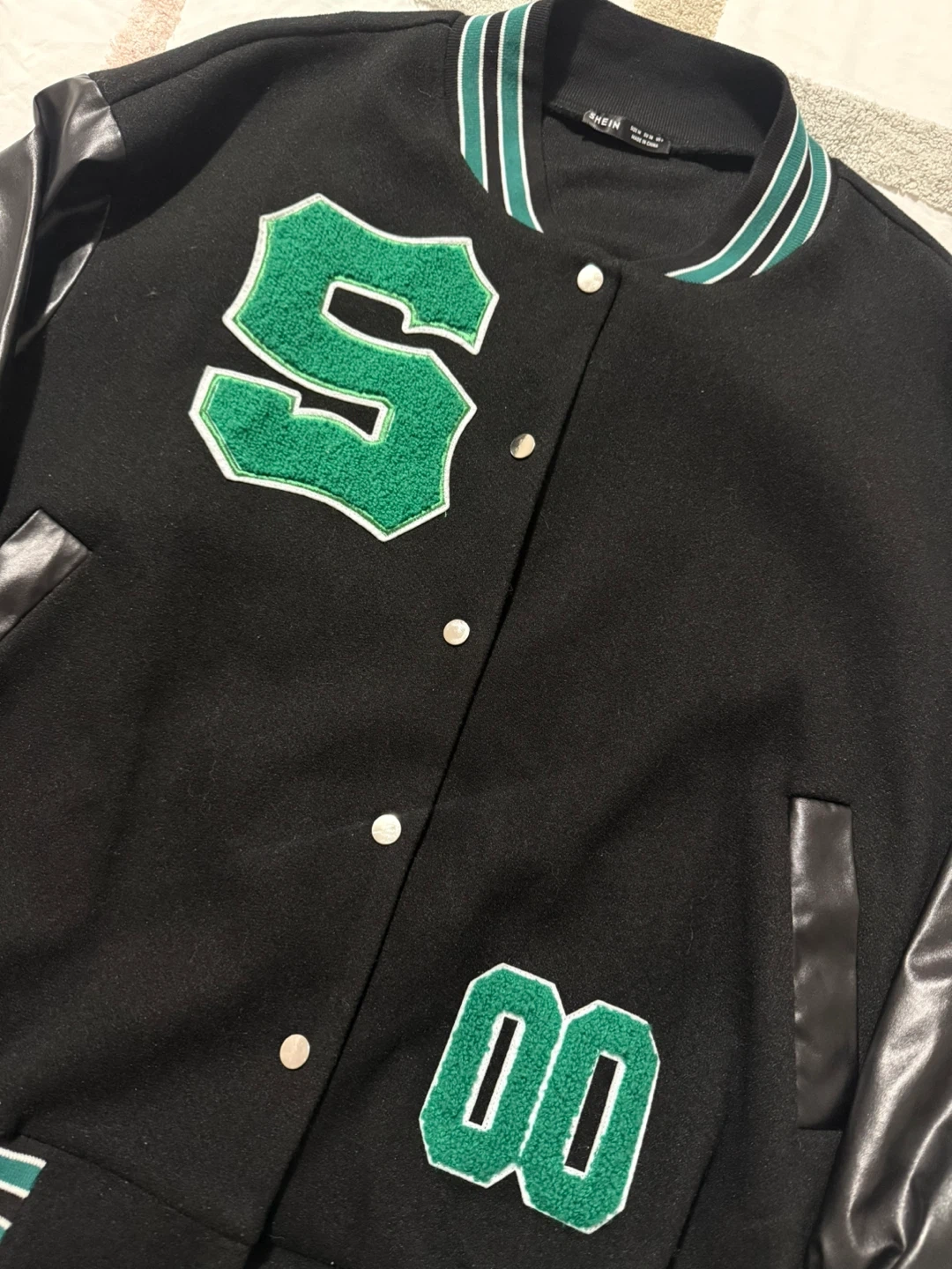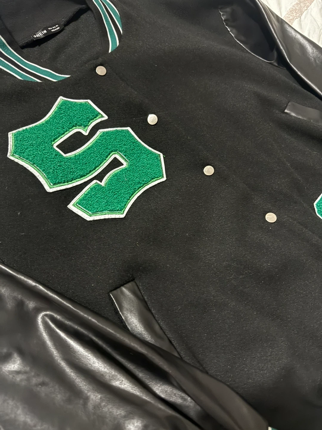 Shein black varsity jacket, in great condition! It has green accents and faux leather sleeves.