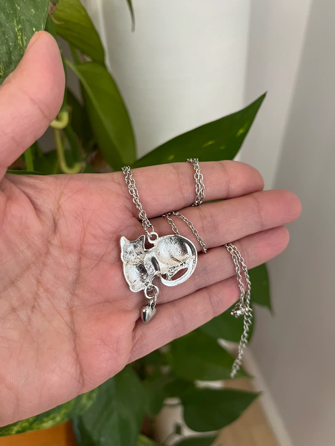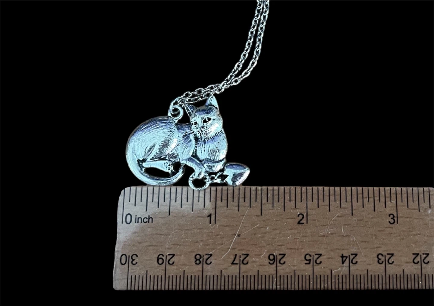This silver-tone necklace features a detailed cat pendant. The chain is approximately 18 inches long. It's a sweet accessory for cat lovers!