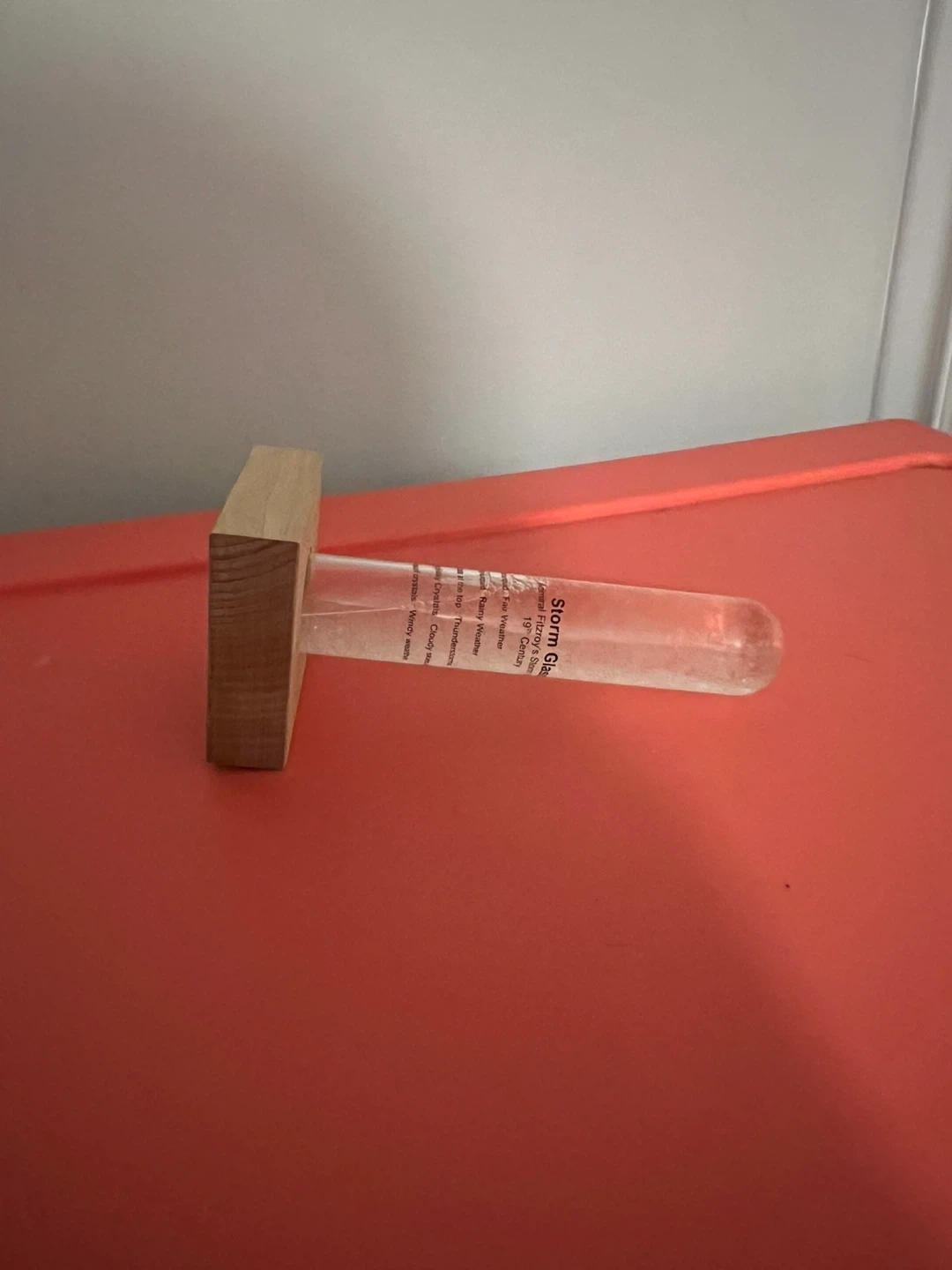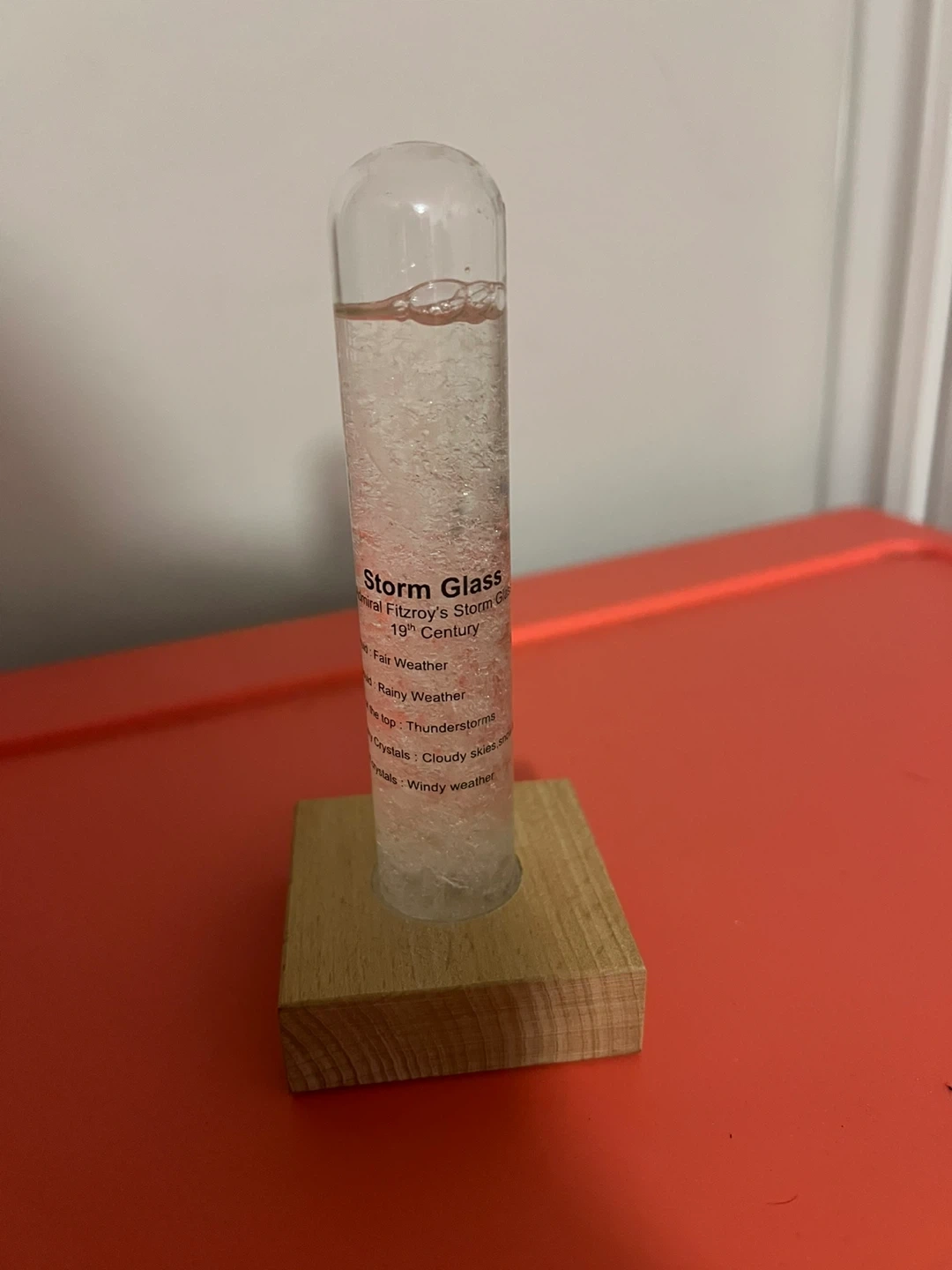 This is a Storm Glass weather predictor. It's based on Admiral Fitzroy's Storm Glass from the 19th Century. The liquid inside changes appearance to predict weather conditions like fair weather, rain, thunderstorms, or windy weather.