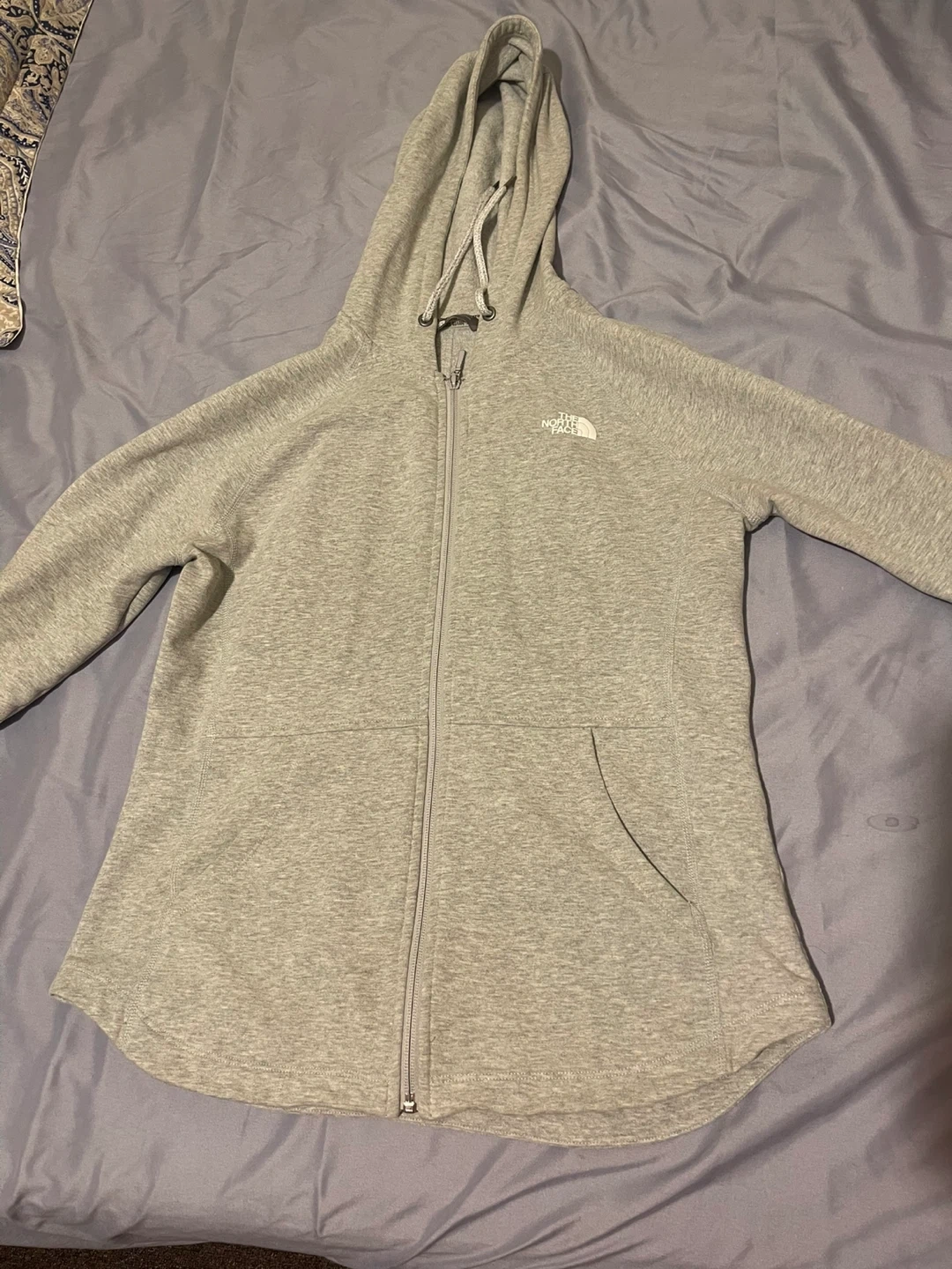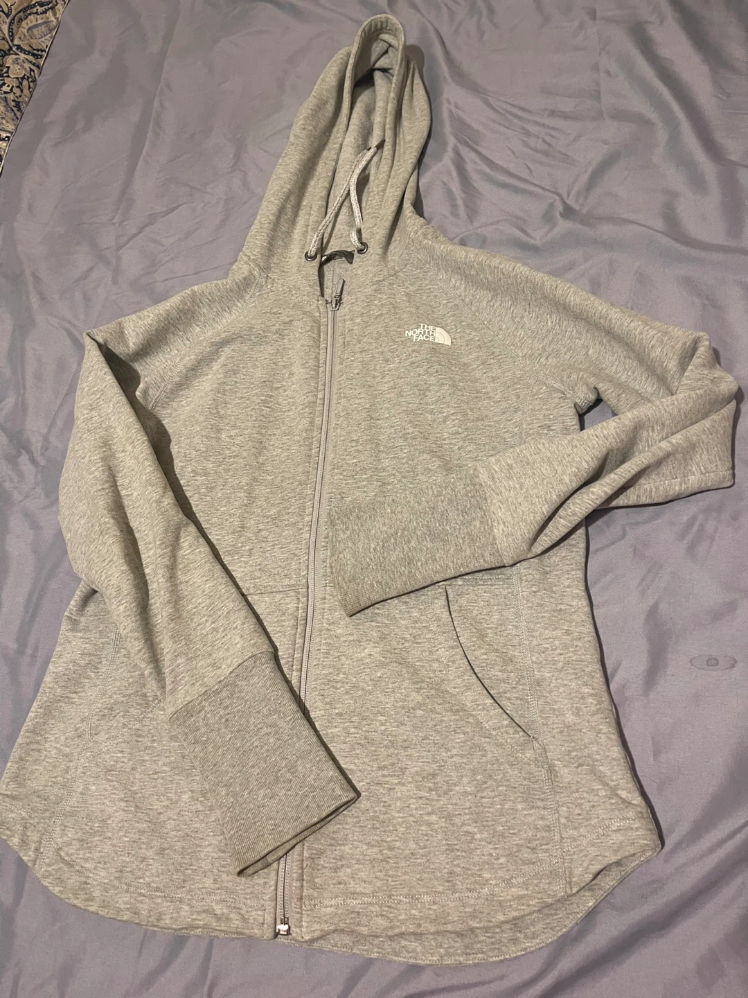 The North Face zip-up hoodie in grey. It's a women's size Medium It's made from a soft fabric blend. This hoodie is great for casual wear or light outdoor activities!