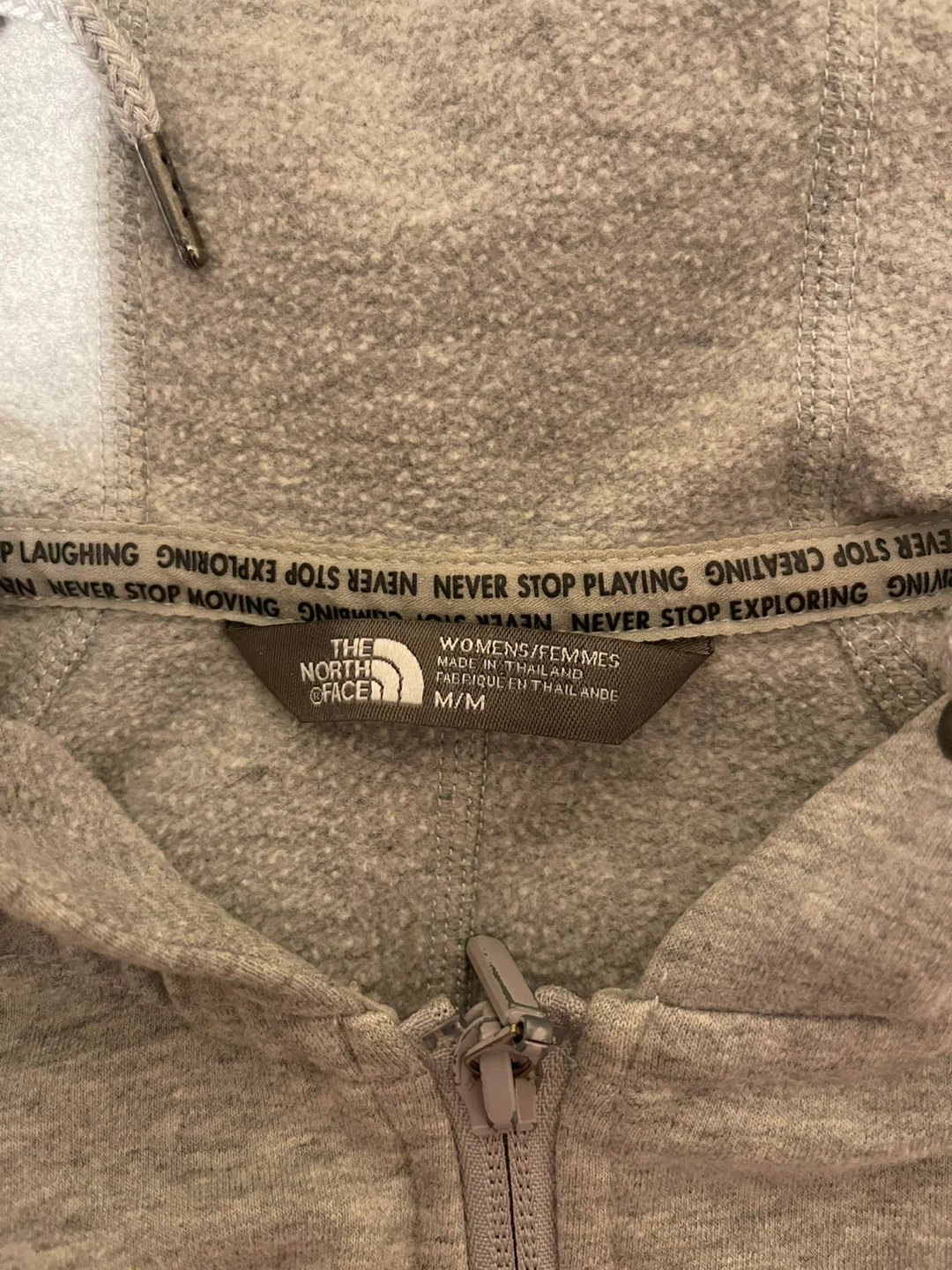 The North Face zip-up hoodie in grey. It's a women's size Medium It's made from a soft fabric blend. This hoodie is great for casual wear or light outdoor activities!