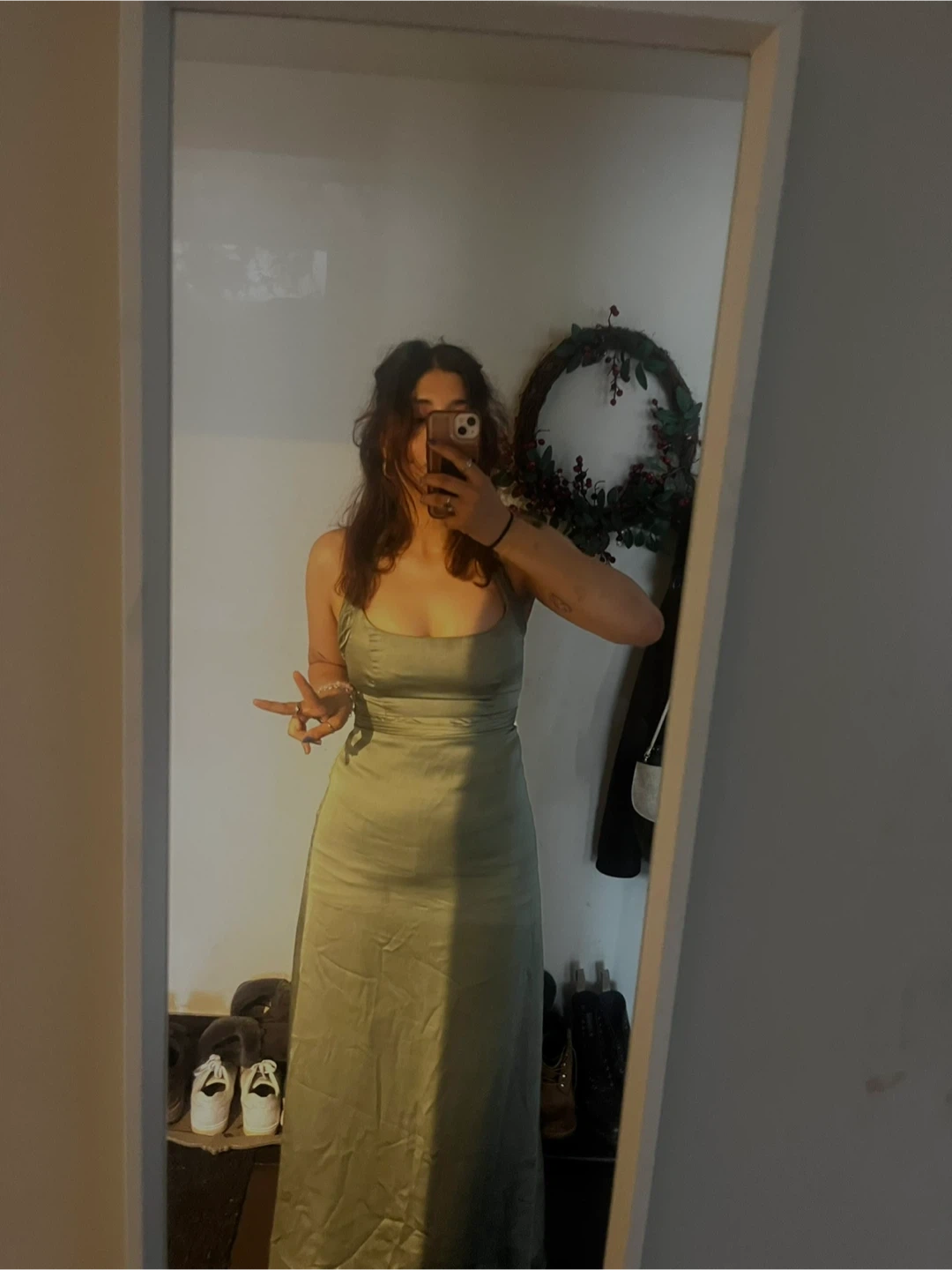 This sage green maxi dress features a flattering silhouette with a square neckline and spaghetti straps. It's made from a smooth, slightly shiny fabric. This dress would be lovely for prom.
