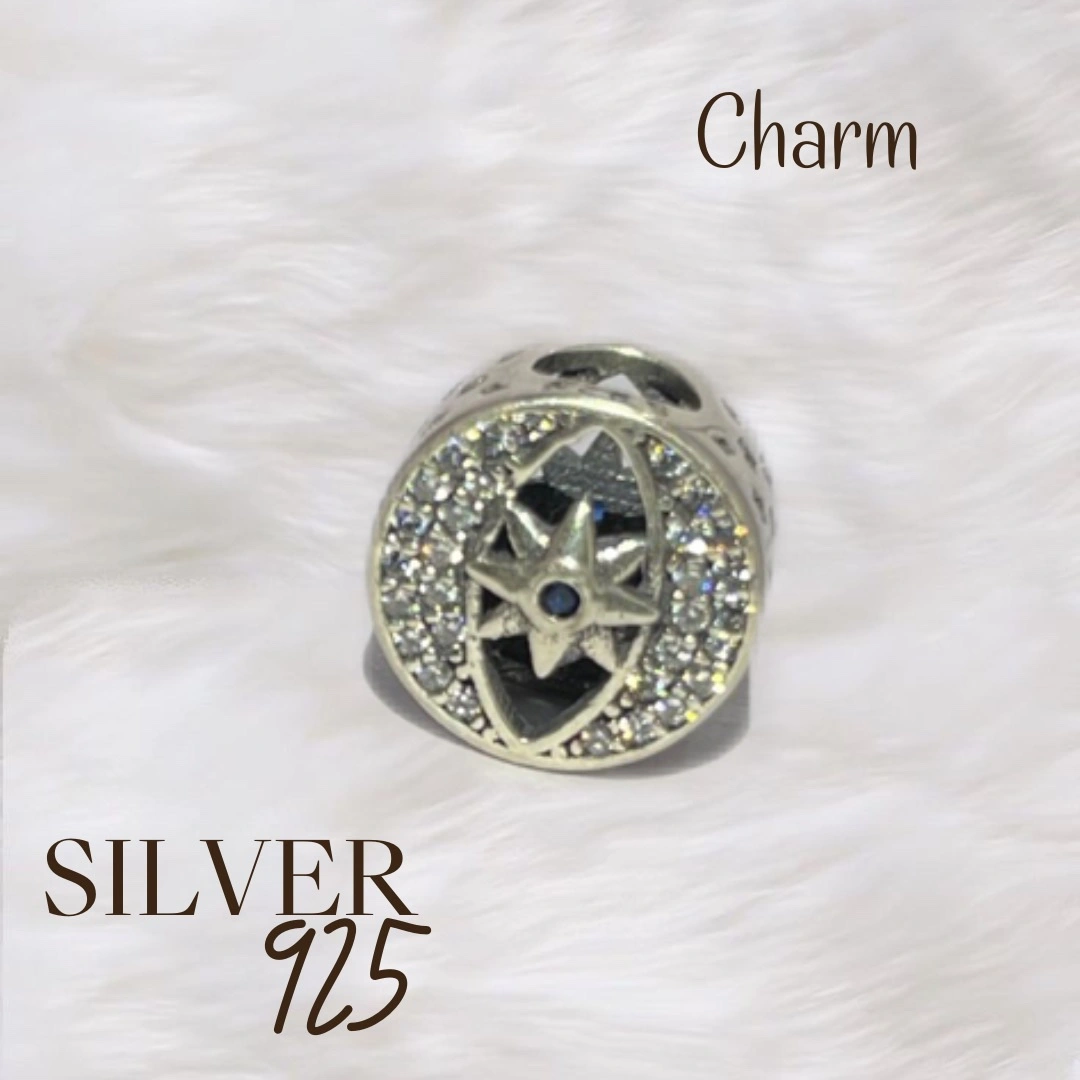 A silver charm featuring a star with a blue stone in the centre, surrounded by clear stones. It is circular in shape and has a silver loop on the top for attaching to a bracelet or necklace.